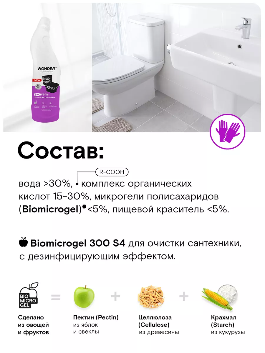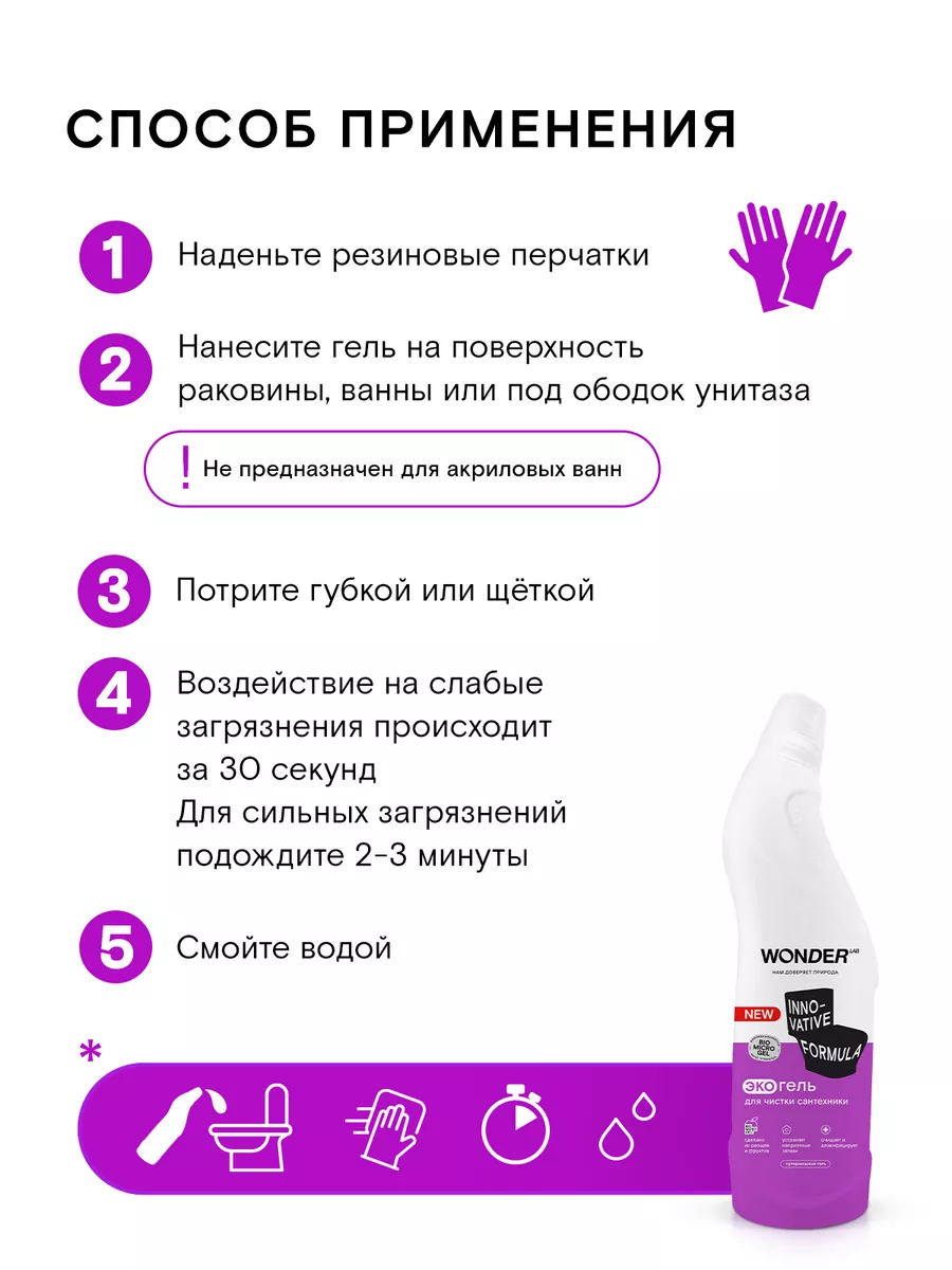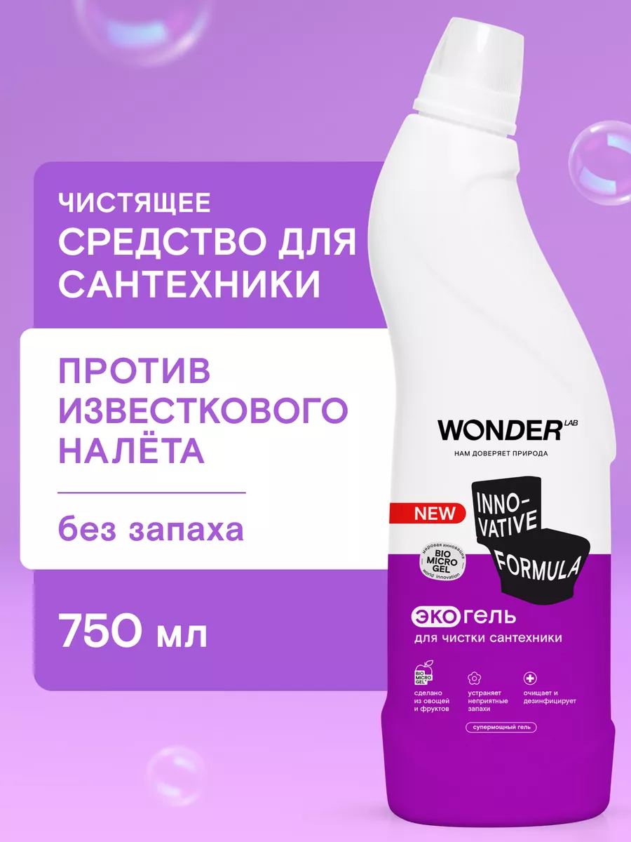 Описание: Средство для чистки унитаза WONDER LAB - 750 мл. Эко средство разработано специально для ежедневной уборки плитки, раковин, ванн, унитазов, фаянсовых изделий, кафеля и смесителей. Средство для сантехники эффективно работает, удаляя все типичные загрязнения в ванной: известковый налет, солевые отложения и другие — всего за 30 секунд! Прекрасно подходит для очистки душевых кабин и панелей в ванной комнате. Жидкость антиналет НЕ ПРЕДНАЗНАЧЕНА для акриловых поверхностей и ванн. Очиститель для унитаза полностью смывается водой, не оставляя пленок, царапин и разводов. Гель для унитаза Вандер Лаб без резкого запаха, отдушек и хлора. Биосовместимый состав безопасен для природы и септиков. Состав чистящего средства для туалета и ванной безопасен для всех членов семьи, природы и септиков. Инновационная формула моющего средства не нарушает экосистему водоемов. Способ применения: наденьте резиновые перчатки, нанесите гель на поверхность раковины, ванны или под ободок унитаза. Потрите губкой или щёткой. Воздействие на слабые загрязнения происходит за 30 секунд. Для сильных загрязнений подождите 2 - 3 минуты, после смойте водой. Мы называем наши продукты экологичными, потому что основа Biomicrogel, который разлагается на 98 процентов за 24 часа. Средства мы делаем из овощей и фруктов. Средство для мытья унитаза без фосфатов и фосфонатов. Вы можете ознакомиться с каталогом бытовой химии для дома Wonder lab - нажав на логотип бренда справа.