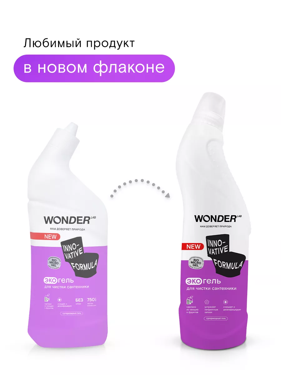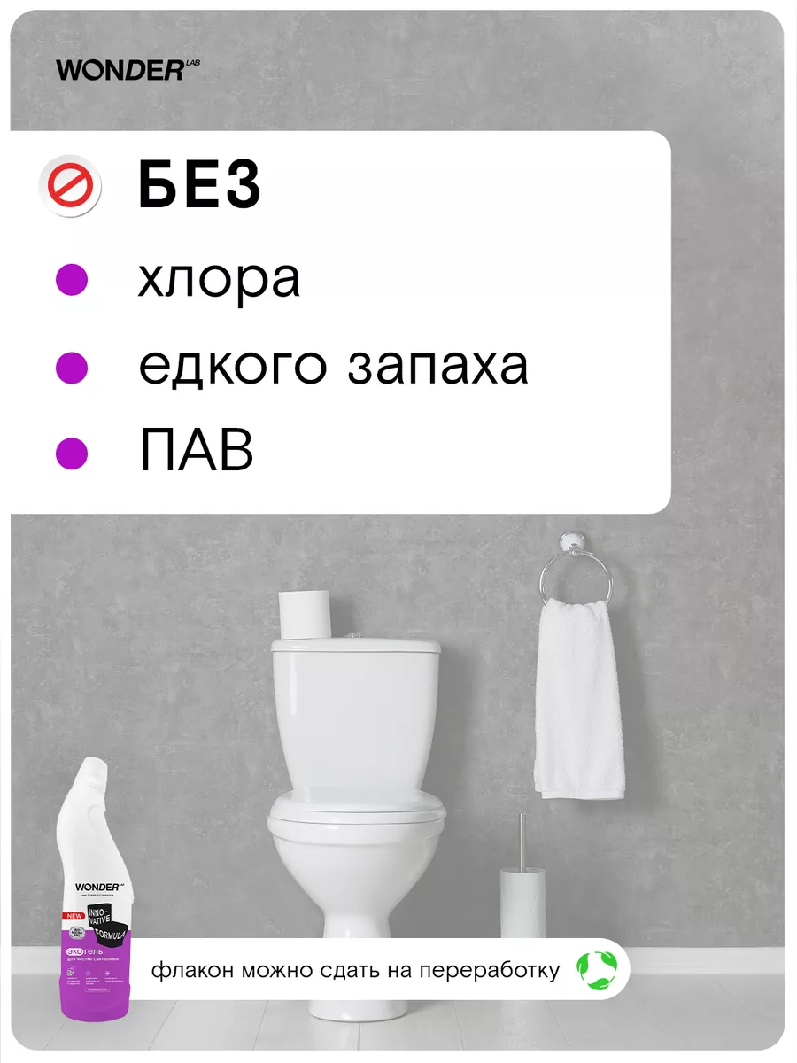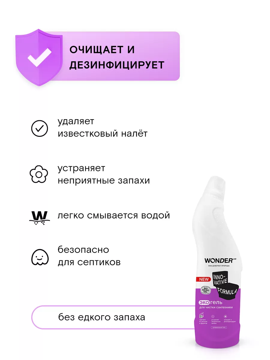Описание: Средство для чистки унитаза WONDER LAB - 750 мл. Эко средство разработано специально для ежедневной уборки плитки, раковин, ванн, унитазов, фаянсовых изделий, кафеля и смесителей. Средство для сантехники эффективно работает, удаляя все типичные загрязнения в ванной: известковый налет, солевые отложения и другие — всего за 30 секунд! Прекрасно подходит для очистки душевых кабин и панелей в ванной комнате. Жидкость антиналет НЕ ПРЕДНАЗНАЧЕНА для акриловых поверхностей и ванн. Очиститель для унитаза полностью смывается водой, не оставляя пленок, царапин и разводов. Гель для унитаза Вандер Лаб без резкого запаха, отдушек и хлора. Биосовместимый состав безопасен для природы и септиков. Состав чистящего средства для туалета и ванной безопасен для всех членов семьи, природы и септиков. Инновационная формула моющего средства не нарушает экосистему водоемов. Способ применения: наденьте резиновые перчатки, нанесите гель на поверхность раковины, ванны или под ободок унитаза. Потрите губкой или щёткой. Воздействие на слабые загрязнения происходит за 30 секунд. Для сильных загрязнений подождите 2 - 3 минуты, после смойте водой. Мы называем наши продукты экологичными, потому что основа Biomicrogel, который разлагается на 98 процентов за 24 часа. Средства мы делаем из овощей и фруктов. Средство для мытья унитаза без фосфатов и фосфонатов. Вы можете ознакомиться с каталогом бытовой химии для дома Wonder lab - нажав на логотип бренда справа.