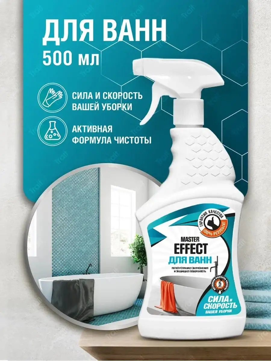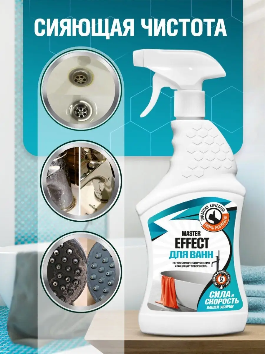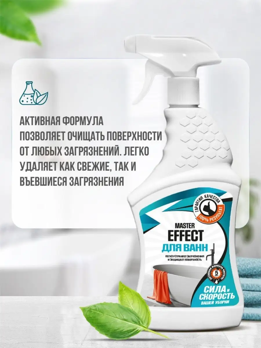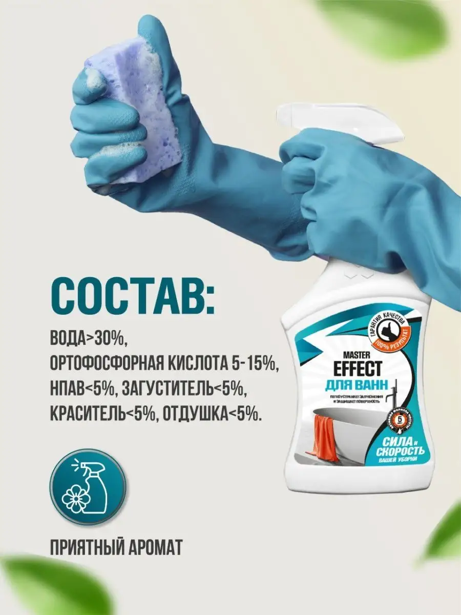 Описание: Спрей для чистки ванн MASTER EFFECT. Средство предназначено для чистки акриловых и эмалированных ванн, раковин, кранов, душевых кабин, кафеля и всех поверхностей в ванной комнате. Легко устраняет загрязнения и защищает поверхность. Удаляет ржавчину, известковые отложения и другие загрязнения. СПОСОБ ПРИМЕНЕНИЯ: средство взболтать! Повернуть крышку распылителя. Нажимая и отпуская рычаг, равномерно нанести средство на очищаемую поверхность. Дать подействовать в течение 5-10 мин, затем смыть водой. Меры предосторожности: ОСТОРОЖНО! Средство содержит кислоту! Не использовать для чистки поверхностей, чувствительных к кислотам. Рекомендуется использовать резиновые перчатки. В случае попадания средства в глаза - тщательно промыть большим количеством воды. Хранить в плотно закрытой таре отдельно от пищевых продуктов, при температуре не ниже 0°С и не выше +25°С. В случае замерзания после размораживания сохраняет свои свойства. БЕРЕЧЬ ОТ ДЕТЕЙ И ЖИВОТНЫХ!