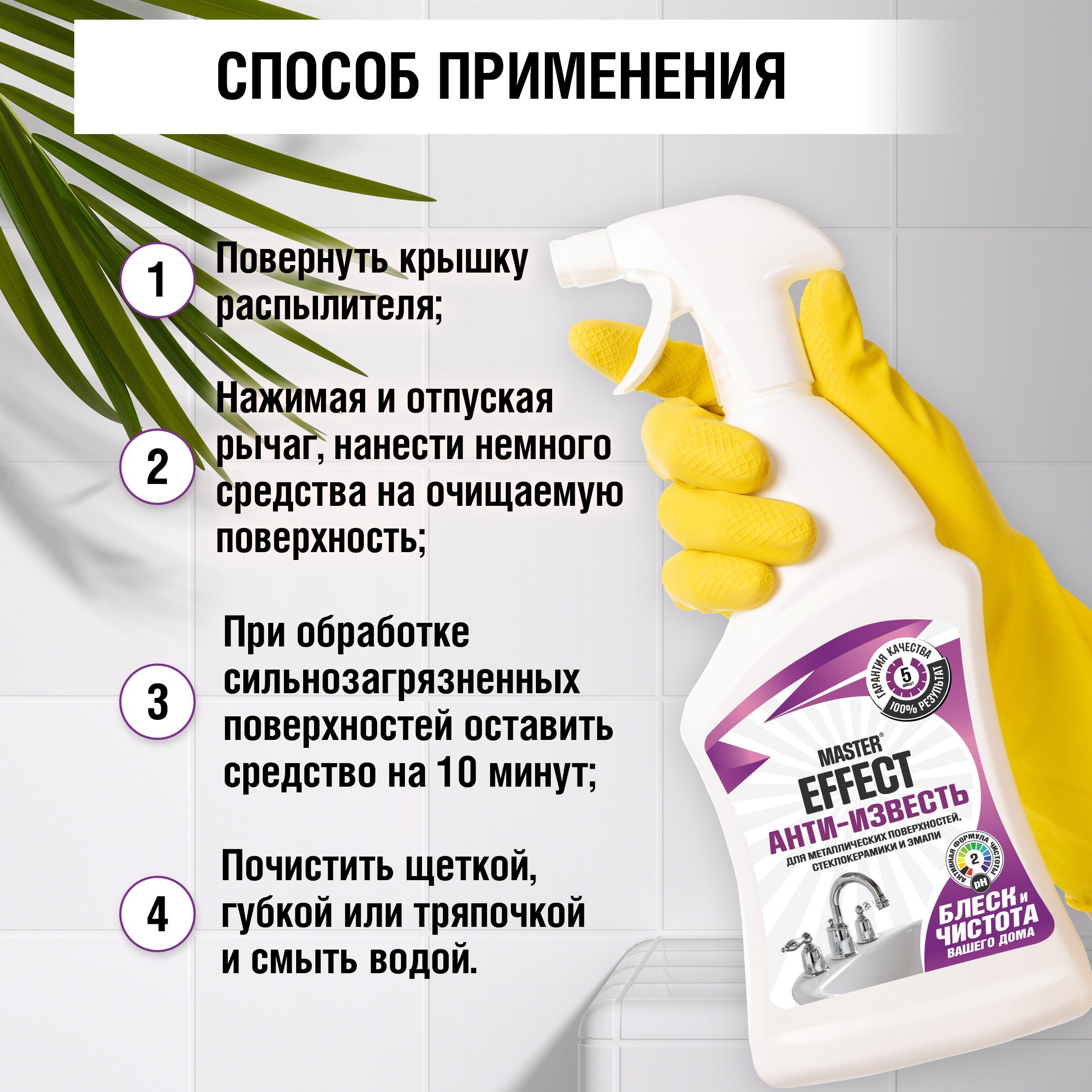 Чистящее средство для ванной Анти-известь от бренда "MASTEREFFECT" - это высокоэффективное средство, которое позволяет эффективно и быстро удалять известковый налет на различных поверхностях в ванной комнате. Благодаря своей уникальной формуле, оно не только мощно очищает поверхности, но и защищает их от дальнейшего образования налета. При этом средство не оставляет разводов и качественно чистит смесители, раковины, ванны, душевые кабины, керамические изделия и множество других поверхностей в ванной комнате. Это отличное решение для тех, кто хочет держать свою ванную комнату в безупречном состоянии и не тратить много времени на очистку.