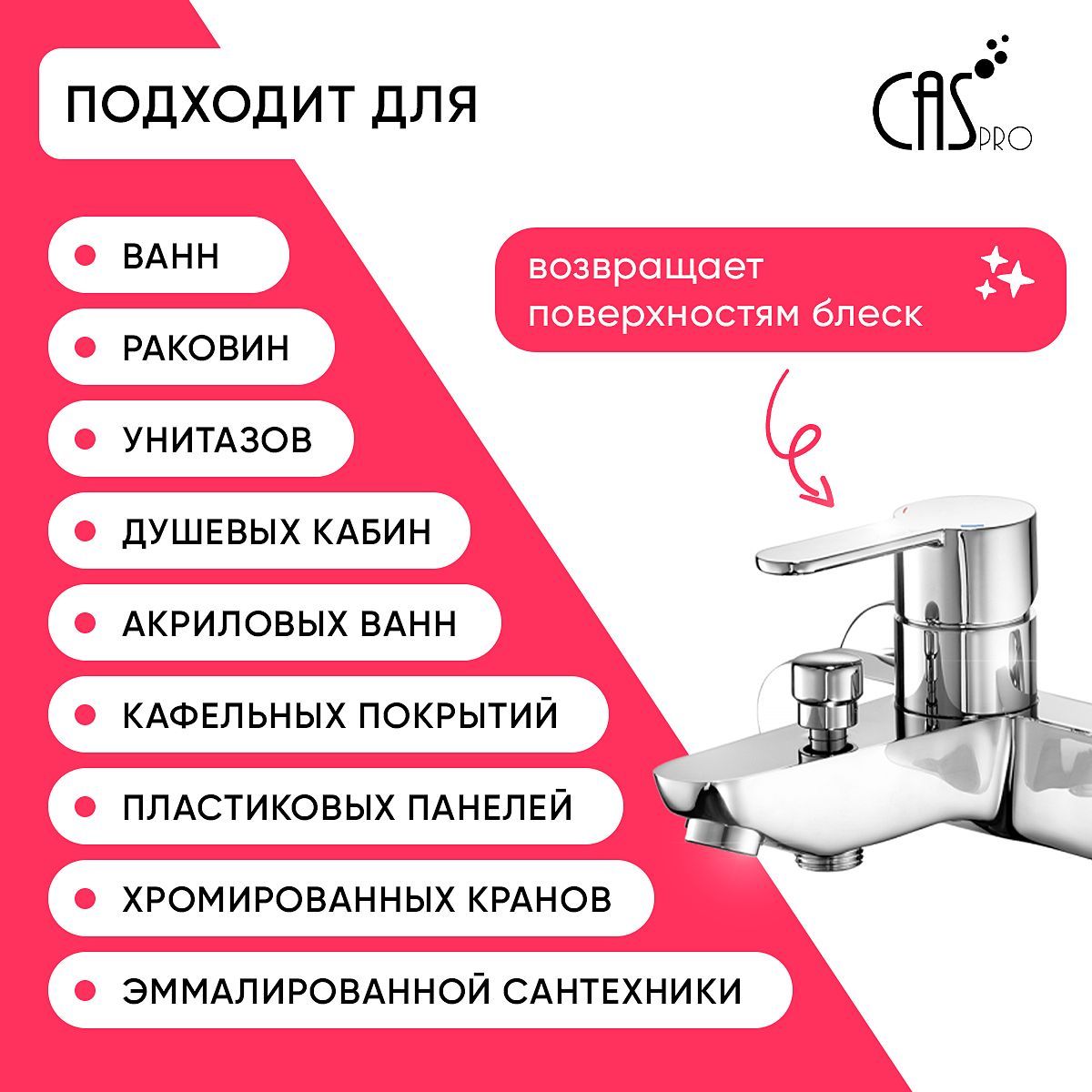Описание: Чистящее средство для ванной комнаты CasPro профессиональная бытовая химияЖидкое средство чистящее подходит для чистки акриловых ванн и душевых кабин - высокоэффективное средство с дезинфицирующим эффектом. Предназначено для ежедневной поддерживающей уборки в ванной комнате используется для ванн, раковин, душевых кабин, акриловых и эмалированных поверхностей, джакузи, кафеля, унитаза, смесителей, фаянсовых изделий, хромированных изделий, бассейнов, стен и полов. Безопасное средство для акриловых ванн и хромированных изделий. Средство с антибактериальным эффектом убивает микробы и бактерии, а также эффективно устраняет неприятные запахи. Смывается на 100% и не остается на поверхностях. Придает блеск поверхностям. Средство бережно очищает полимерные покрытия, удаляя от известкового налета, потеков ржавчины, мыльных разводов и солевых отложений, плесень и грибок не повреждая поверхность, придает блеск и оставляет защитный нанослой, препятствующий последующим загрязнениям. Эффективно удаляет сложные и застарелые загрязнения. Придает поверхности чистоту и блеск, сохраняя эффект антиналет на несколько дней. Не придется использовать набор скребок и жестких щеток, достаточно мягкой тряпки, губки и салфетки. Безопасно для стеклокерамики, металлических акриловых поверхностей, раковин из нержавеющей стали. С помощью спрея даже генеральная уборка в доме проходит легко и быстро. Экологически безопасное чистящее, моющее Российского производства. Раствор проникает в структуру загрязнений, разрушая частицы солевых отложений и удаляя неприятный запах. Многофункциональное дезинфицирующее средство не содержит хлора и щелочных веществ. Приобретая чистящие и моющие товары бытовой химии для вашего дома, офиса, дачи.