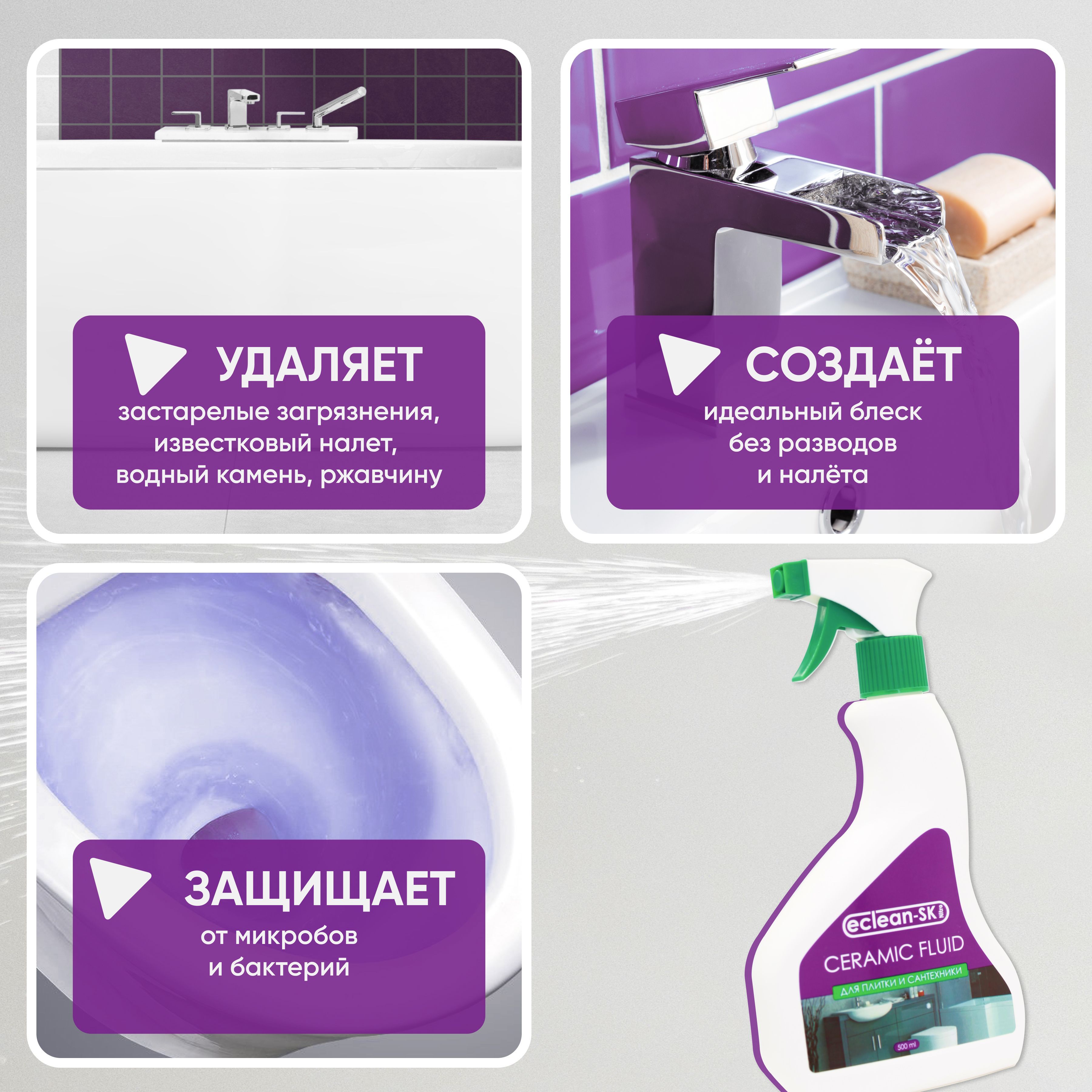 Назначение чистящего средства для ванной и туалета: Для кафеля, Для сантехники, Для керамических поверхностей, Для душевой кабины, Для унитаза, Универсальное