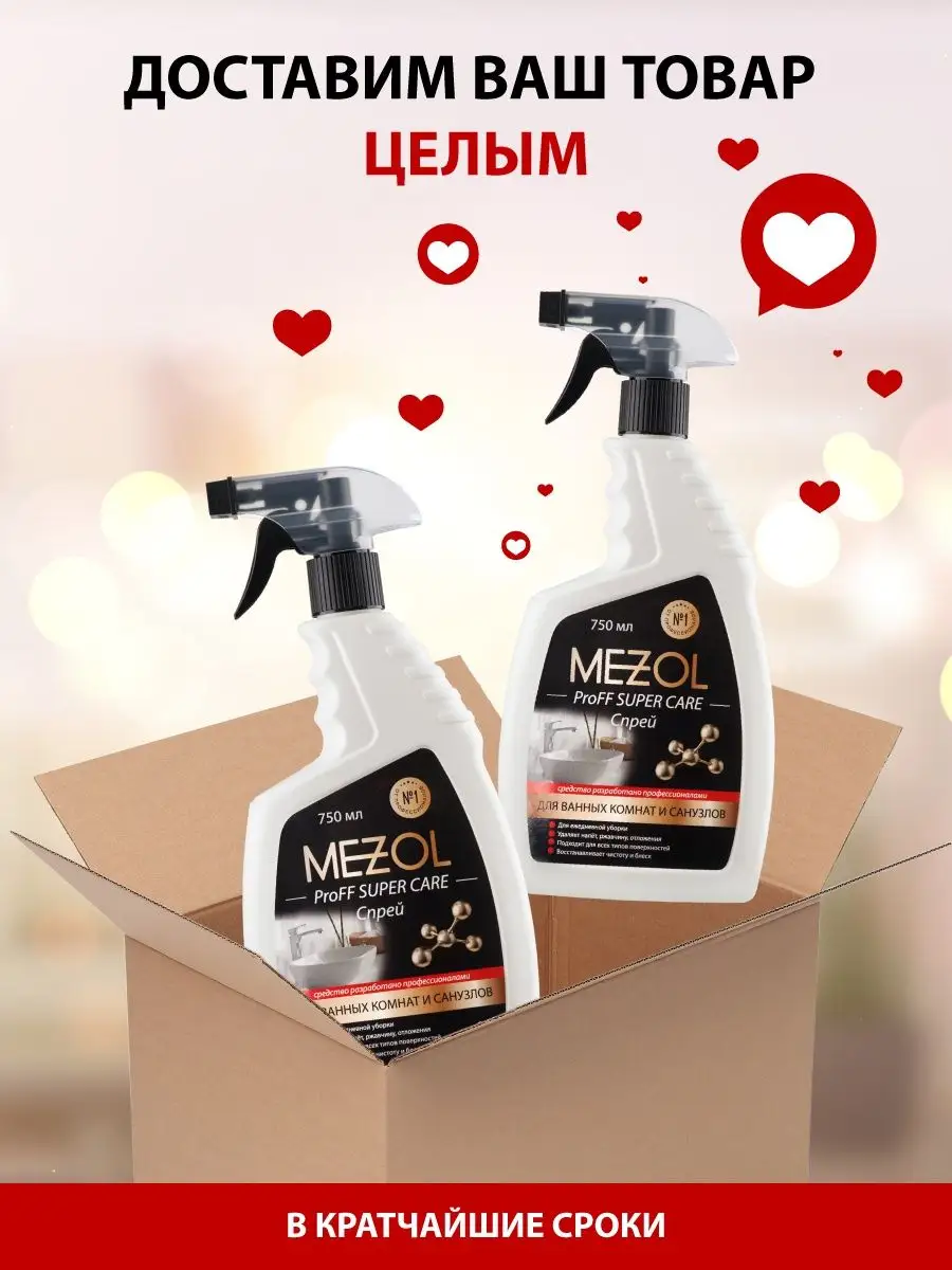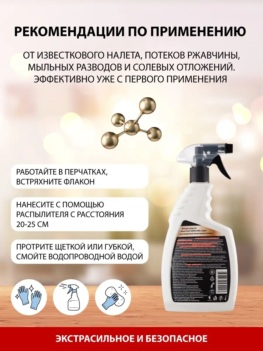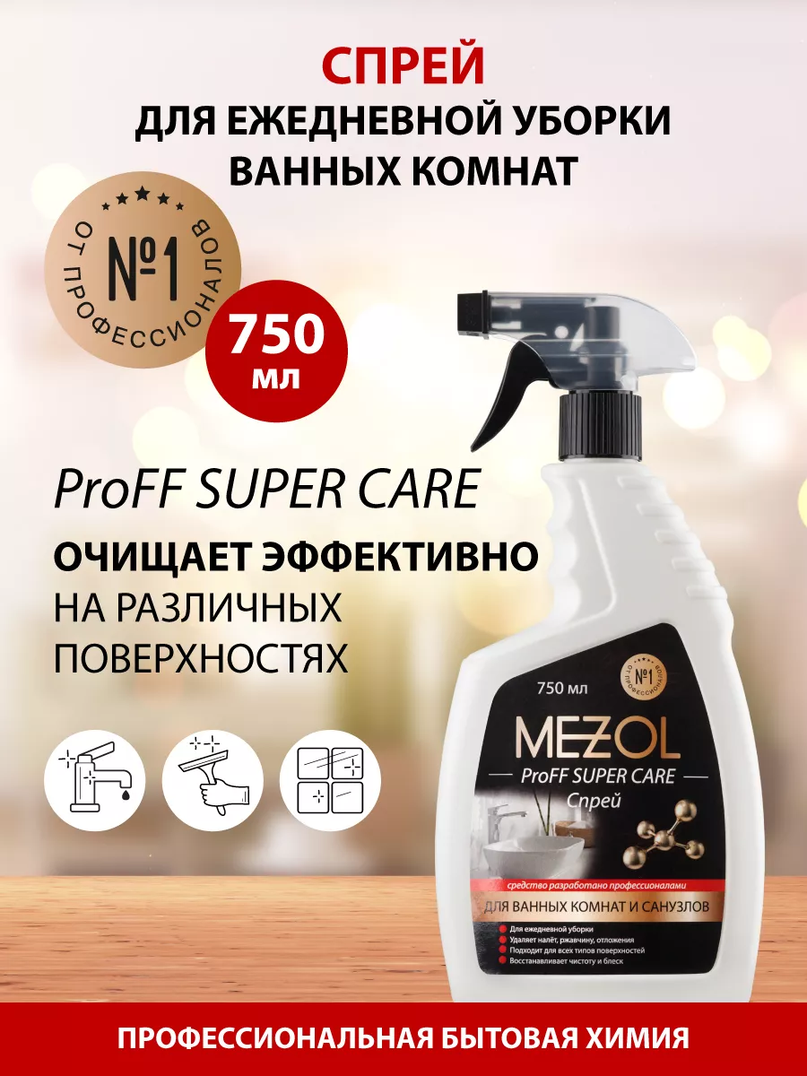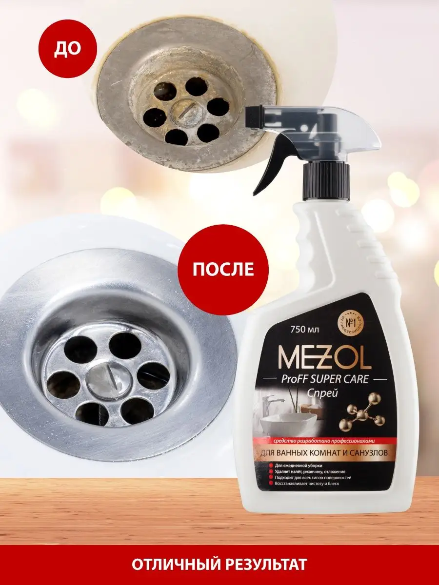 Описание: Чем отмыть сантехнику?Моющее средство для ванно и сантехники Mezol ProFF SUPER CARE Спрей для ежедневной уборки ванных комнат. Для эффективной чистки ванн, душевых кабин, раковин, унитазов, сантехники, кафеля, керамической плитки, акриловых, фаянсовых и эмалированных поверхностей и других сантехнических устройств в бытовых и коммерческих помещениях. Мезоль Супер каре средство для ванной от налета подходит для акриловых поверхностей, удаляет известковый налет, ржавчину, мыльных разводов и солевых отложений и другие загрязнения. Средство имеет форму спрея, что обеспечивает удобство и эффективность во время мытья. Моющее средство мезоль для сантехники содержит химические компоненты, которые позволяют быстро и безопасно отмыть все поверхности в ванной комнате.Средство для ванной Супер каре не содержит агрессивных добавок, что делает его безопасным для использования в домашних условиях. Кроме ванных комнат, данный спрей также подходит для чистки кухонных поверхностей, уборки туалета и сантехнике других помещений. Чистящий спрей для ванны обладает антиналетным эффектом, который предотвращает образование налета на поверхностях, а также удалит уже существующий. Средство подходит для ежедневной уборки и позволяет быстро и эффективно очистить все поверхности в ванной комнате. Чистящее средство для ванны и сантехники Мезол- это универсальный спрей, который является отличным выбором для ежедневной чистки. Средство для ванны и санузла быстро и эффективно удаляет загрязнения, обладает антиналетным эффектом и безопасно для использования в домашних условиях. Использовать согласно инструкции на упаковке. В случае сильного загрязнения - повторите действие, увеличив время обработки до 5-10 минут. Осторожно – содержит кислоту! Не применять для оцинкованных поверхностей и поверхностей из алюминия. При попадании на кожу, промыть пораженный участок большим количеством воды. Работать в перчатках. Вы можете ознакомиться с ассортиментом бытовой химии Mezol - нажав на логотип бренда.