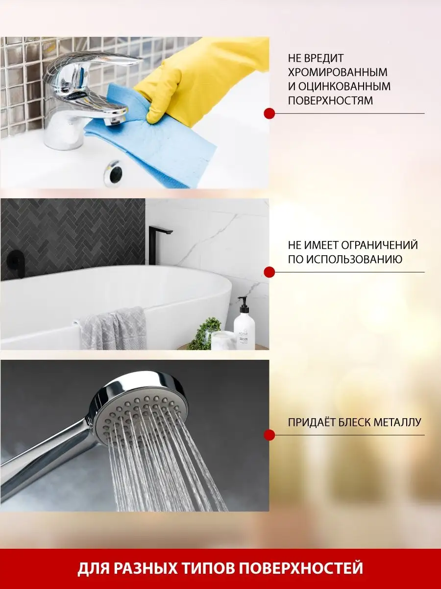 Эффект средства для удаления известкового налёта, солевых отложений, мыльных разводов, потёков ржавчины; для ежедневной уборки всех видов поверхностей; антибактериальный эффект + блеск на несколько дней