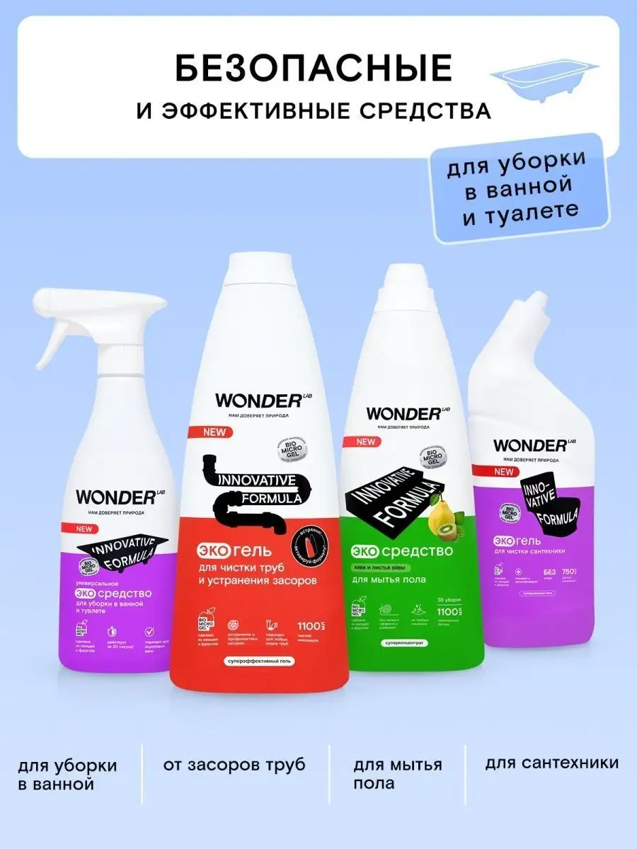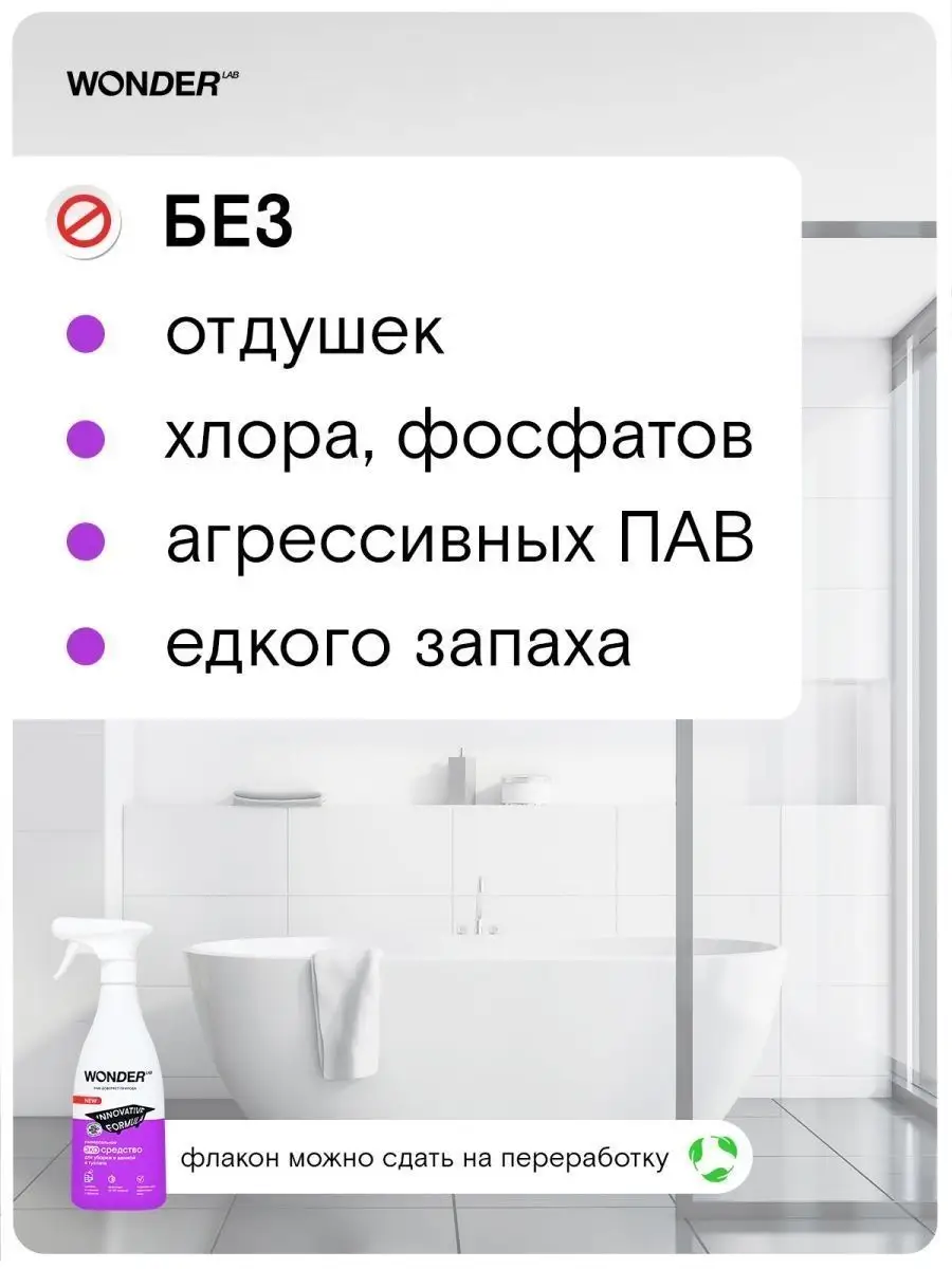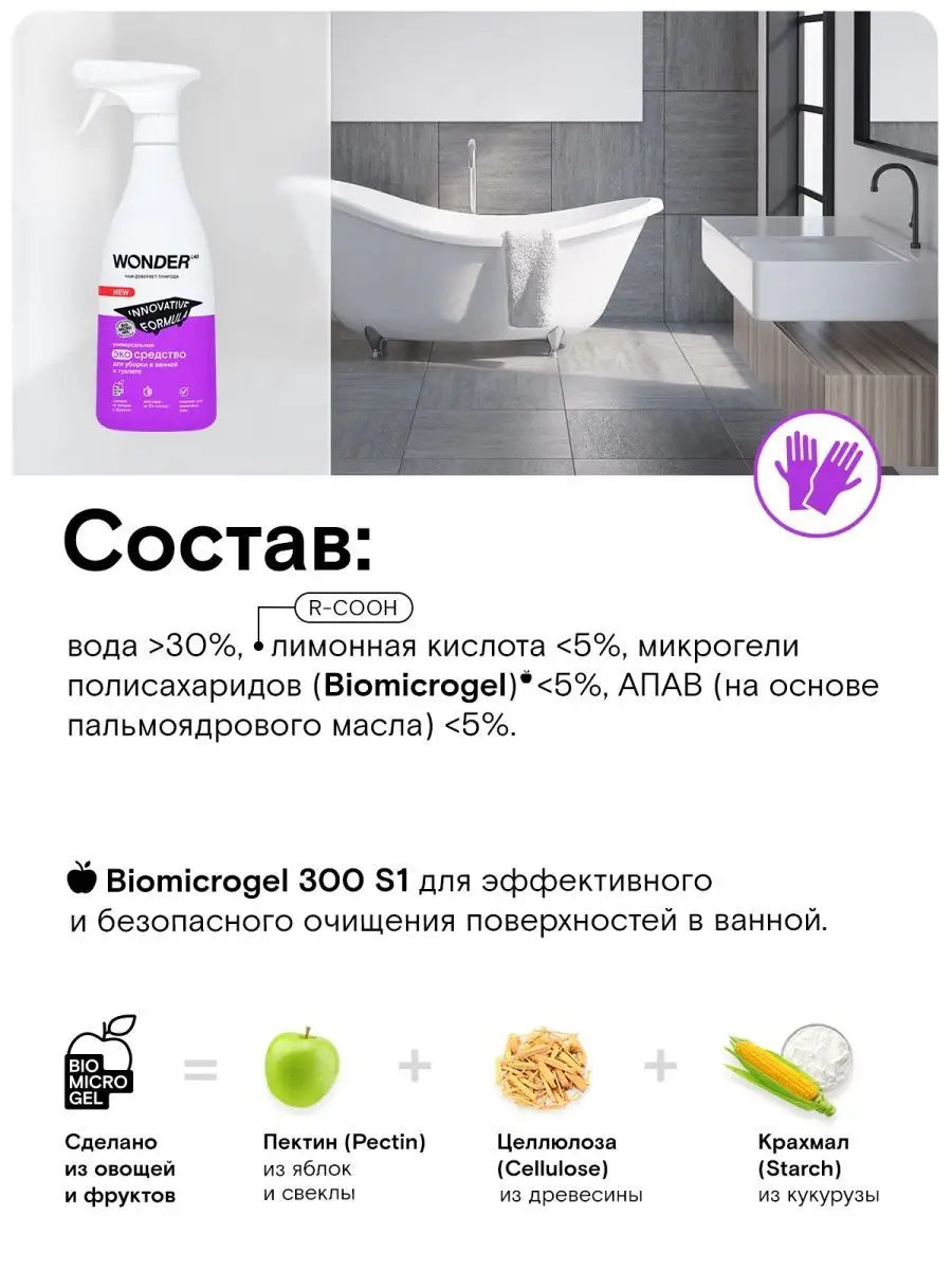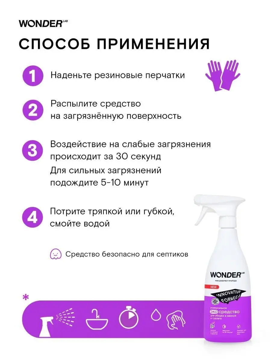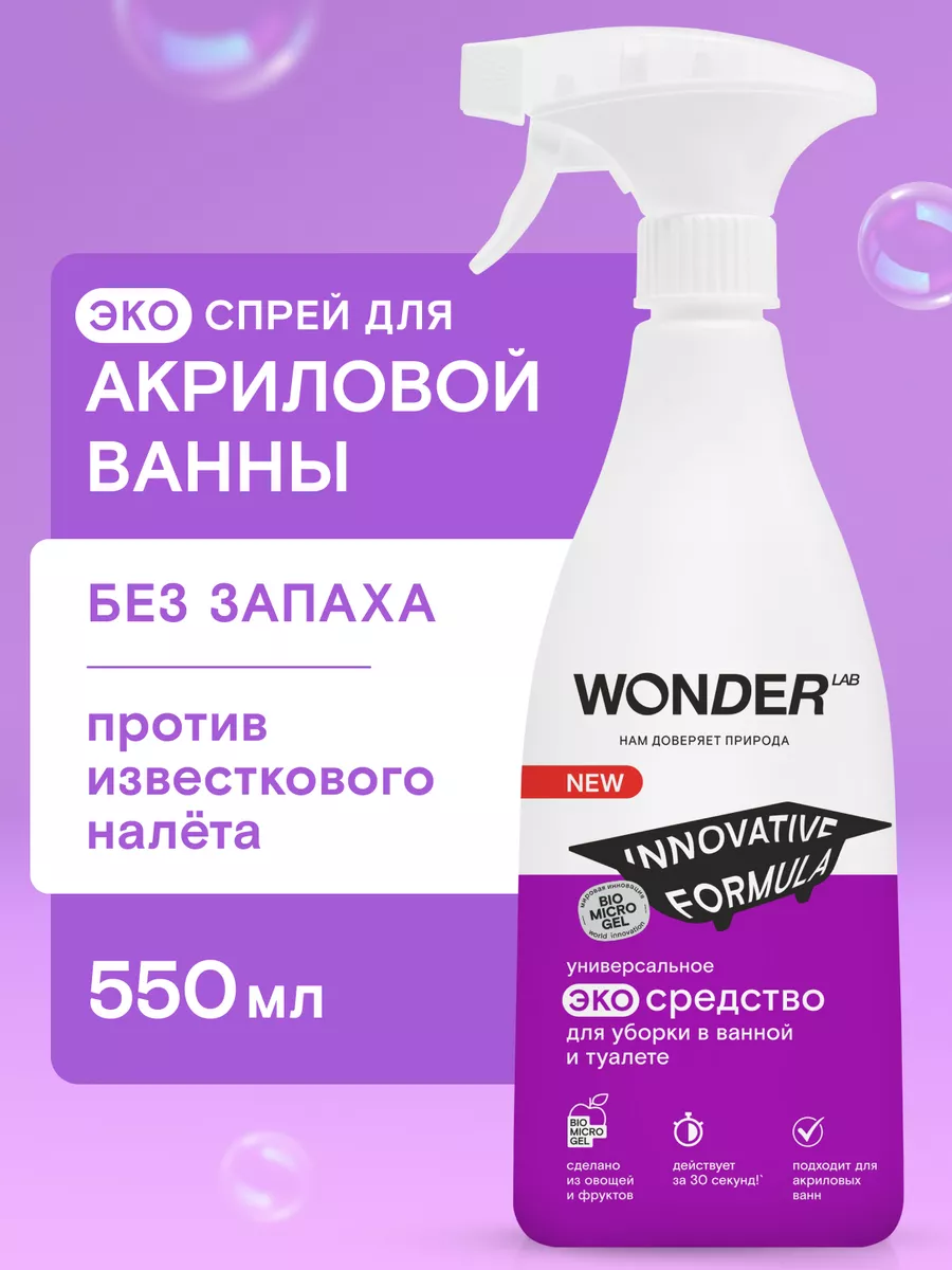 Описание: Средство для акриловых ванн Wonder Lab - 550 мл. Эко средство для мытья ванны Wonderlab от известкового и мыльного налета подходит для ежедневной чистки душевых кабин и панелей в ванной комнате. Бережно работает на акриловых ваннах (поверхностях), раковинах, унитазах, смесителях и плитке (кафеле). Формула BIOMICROGEL делает жидкость очень эффективной, всего за 30 секунд очиститель удаляет все загрязнения - известковый и мыльный налёт, ржавчину. Спрей для уборки полностью смывается водой, не оставляя плёнок, царапин и разводов. Моющие средства препятствуют повторному загрязнению. Универсальное средство для сантехники без резкого запаха, отдушек и хлора. Состав эко средства для ванны безопасен для природы и септиков. Способ применения: наденьте резиновые перчатки, распылите чистящее средство Вандер Лаб на загрязнённую поверхность. Удаление слабых загрязнений происходит за 30 секунд, для сильных загрязнений подождите 5-10 минут. Потрите тряпкой или губкой, смойте водой. Не поддерживаем тестирование на животных. Мы называем наши продукты экологичными, потому что основа Biomicrogel, который разлагается на 98 процентов за 24 часа. Средства мы делаем из овощей и фруктов. Средство для унитаза без фосфатов и фосфонатов. Вы можете ознакомиться с каталогом бытовой химии для дома Wonder lab - нажав на логотип бренда справа.