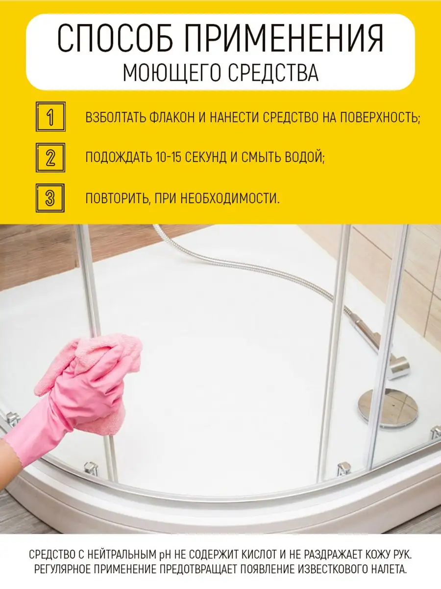 Описание: Универсальный очиститель для ванной комнаты и душевой кабины - отличный помощник в уборке дома. Спрей подходит для очистки стекол и зеркал, стеклянных стенок и дверей душевой кабинки, при этом жидкость не оставляет разводов на стенах и глянцевых покрытиях. Антибактериальный состав домашнего моющего средства подходит для уничтожения вредных бактерий, для удаления грибка и плесени. Продукт подходит для чистки и мытья раковин, унитазов, акриловых ванн и аксессуаров, защитит поверхности от грязных пятен и пыли, разводов от мыла и известкового налета, придает блеск. Стеклоочиститель с функциями антиналета и антиплесени с нейтральным pH не содержит кислот и щелочей, которые могут раздражать кожу рук, однако рекомендуем обеспечить дополнительную защиту в виде хозяйственных перчаток. Удобный флакон с распылителем облегчает процесс очистки поверхностей и предметов, а большой объем бутылки позволяет сэкономить на покупке новых средств. Порядок использования бытовой химии для уборки: 1) Взболтайте флакон и нанесите продукт на поверхность; 2) Подождите 10-15 секунд и смойте водой; 3) При необходимости, повторите процедуру. Данный товар оценят по достоинству все домовитые хозяйки.