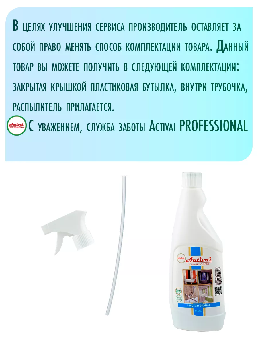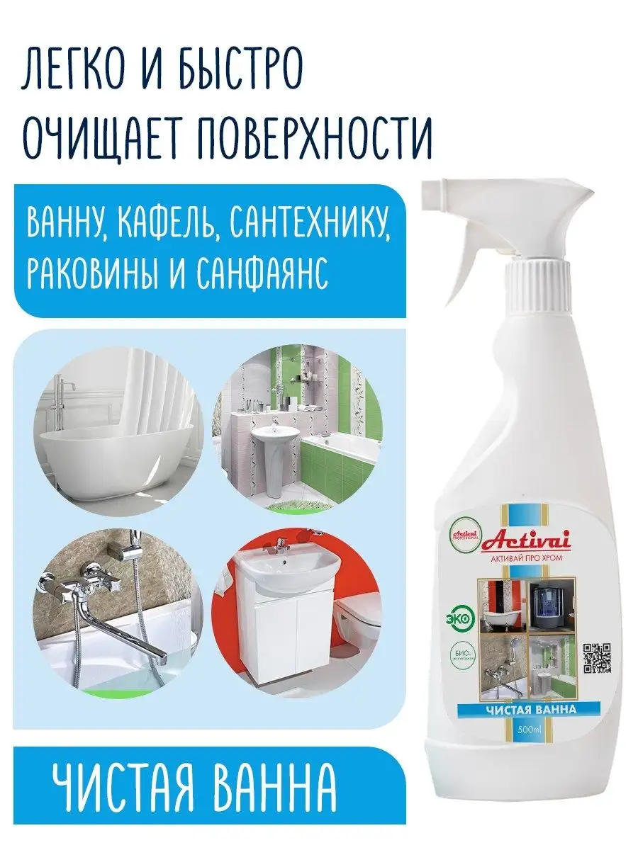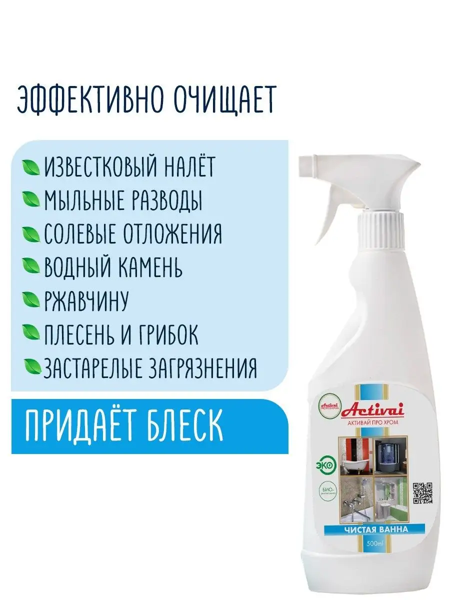 Описание: Чистая Ванна Activai Professional — универсальное чистящее средство для ванны и туалета. Концентрированное моющее средство подходит для ежедневной уборки ванной комнаты, душевой кабины и сантехники, керамической плитки, акриловых фаянсовых и эмалированных поверхностей. Средство для мытья бережно очистит хромированные и стальные поверхности, отмоет краны и смесители, полотенцесушители, кафель в ванной и кухне. Спрей для уборки легко справляется с известковым и мыльным налетом ( антиналет), плесенью и грибком, потеками ржавчины, разводами и солевыми отложениями на любых поверхностях. ЭКО очиститель подходит для всех видов поверхностей устойчивых к кислотным моющим средствам. Жидкость для чистки с антибактериальным эффектом убивает микробы и бактерии, а также эффективно устраняет неприятные запахи. Не содержит красителей растворителей. Не оставляет разводов. Перед применением протестировать моющее средство на небольшом, незаметном участке. Не использовать спрей на золотистых, медных, покрытых патиной, а также алюминиевых поверхностях. Способ применения: нанести на поверхность и обработать ее с помощью тряпки для уборки или губки, затем смыть водой. При сильных загрязнениях повторить обработку. Товар сертифицирован. Бытовая химия Activai Professional — это безопасные биоразлагаемые чистящие средства для дома.