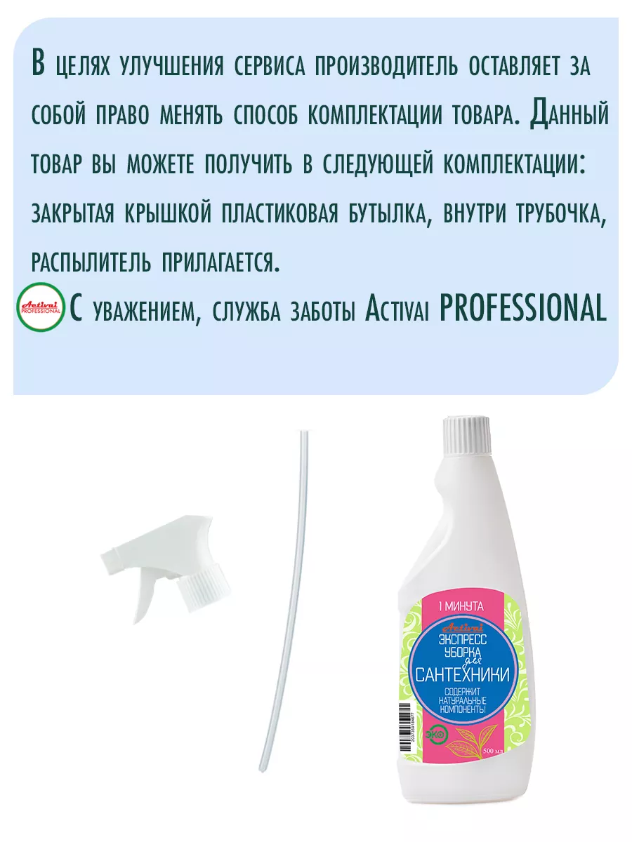 Описание: Экспресс Уборка для сантехники от бренда Activai Professional – это универсальное средство для чистки ванной и душевой кабины, акриловых стекол и зеркал, плитки пола туалета в доме, на даче или в квартире. Моющее средство безопасно для использования в домах, где живут дети и животные, так как содержит только экологически чистые компоненты и не содержит хлора. Данное чистящее средство легко и быстро наносится на поверхности и не требует длительного воздействия. Достаточно нанести жидкость на поверхность, подождать несколько минут и смыть водой, чтобы удалить налет, известковый налет, пятна и разводы. Спрей для уборки используют для чистки разных поверхностей, таких как ванна душевая кабина, туалет и зеркала, пол и даже кухонные поверхности. Средство для сантехники является незаменимым помощником для проведения уборки в доме или на даче. Оно поможет вам быстро и легко убраться в ванной комнате, убрать налет на стеклах, убрать пятна на полу и туалете. Перед применением протестировать жидкость для мытья на небольшом, незаметном участке. Не использовать на золотистых, медных, покрытых патиной, а также алюминиевых поверхностях. Activai Professional — это безопасная биоразлагаемая бытовая химия для дома и дачи. Применять согласно инструкции!