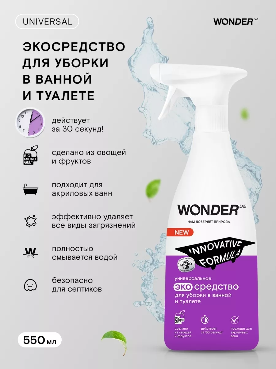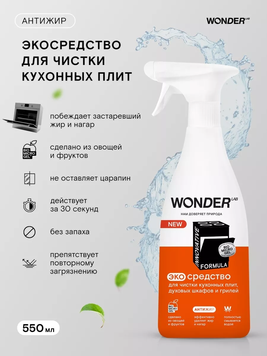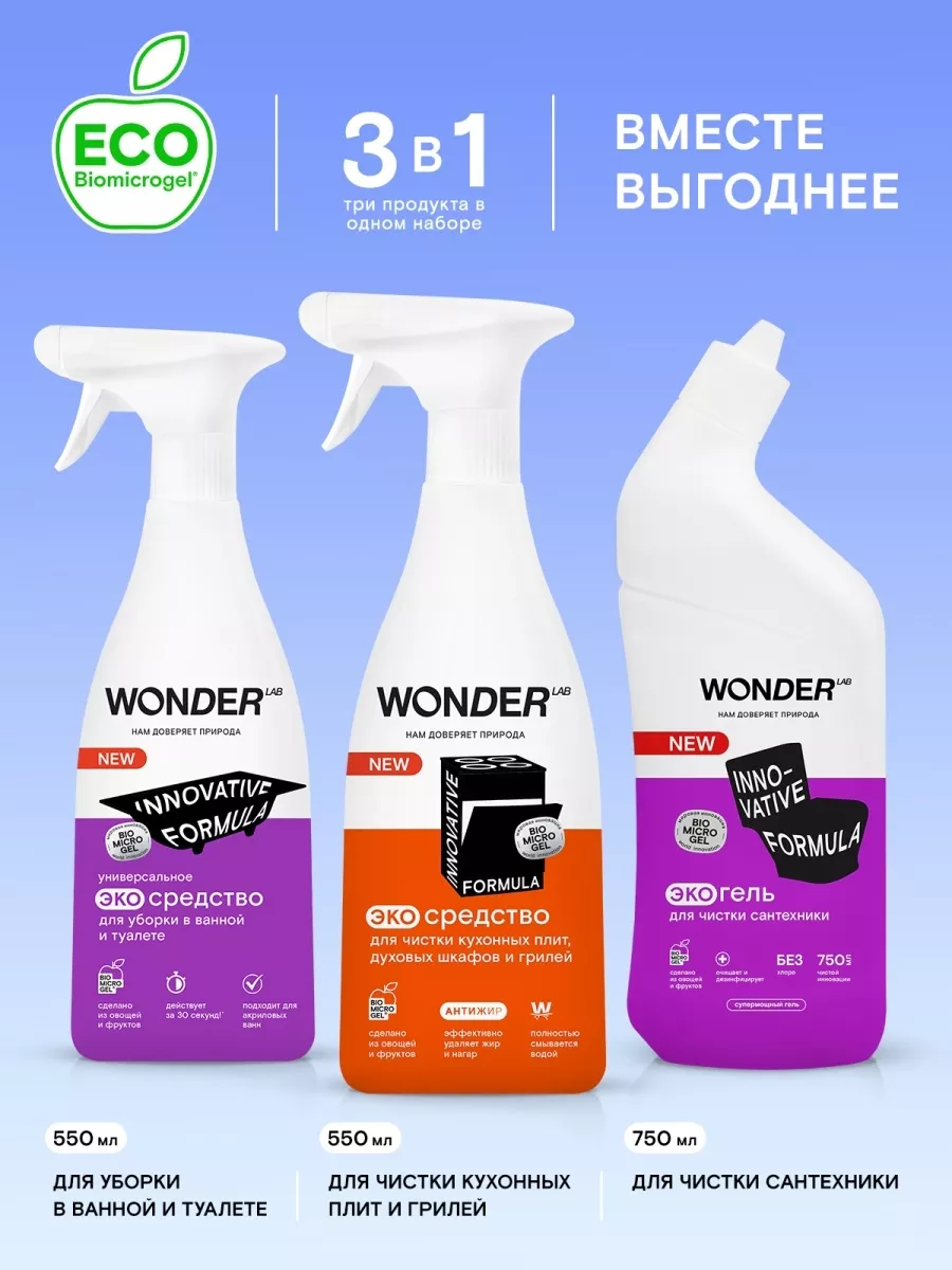Описание: Средства для уборки на кухне и в ванной WONDER LAB. Наборы для уборки WONDER LAB - это набор с экологичными средствами для ежедневной уборки, состоящий из трёх чистящих средств. В состав эко наборов входят: - Средство Антижир - супермощное средство, разработанное специально для чистки кухонных плит, духовых шкафов и грилей. Эффективно удаляет застарелый жир и нагар всего за 30 секунд! Отлично устраняет неприятные запахи. - Чистящее средство для уборки в ванной и туалете Вандер Лаб - разработано специально для ежедневной уборки. Оно чудесно подходит для очистки душевых кабин и панелей в ванной комнате, а так же бережно работает на акриловых поверхностях, раковинах, унитазах, смесителях и плитке. - - Чистящее средство для сантехники Вандер Лаб - разработано специально для ежедневной уборки плитки, раковин, акриловых ванн, унитазов и смесителей. Эффективно работает, удаляя все типичные загрязнения в ванной: известковый налет, ржавчину и другие - всего за 30 секунд! Прекрасно подходит для очистки душевых кабин и панелей в ванной комнате. Средства WONDERLAB сделаны на основе уникальной и инновационной формулы BIOMICROGEL. Компонент не нарушает экосистему водоемов, разлагается в природе на 98% за 1 день. Мы называем наши продукты экологичными, потому что основа биомикрогели, который разлагается на 98 процентов за 24 часа. Средства мы делаем из овощей и фруктов. Наши средства не содержат синтетические АПАВ, SLS, SLES, фосфаты, фосфонаты, компоненты, содержащие активный хлор и прочее без потери моющей способности. Каталог бытовой химии WONDER LAB разнообразен. Вы можете ознакомиться со всем ассортиментом Вандер Лаб - нажав на логотип бренда справа.