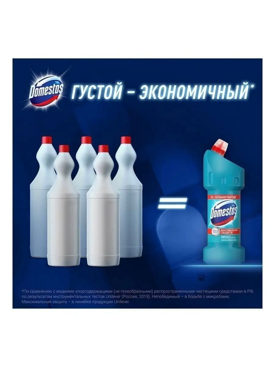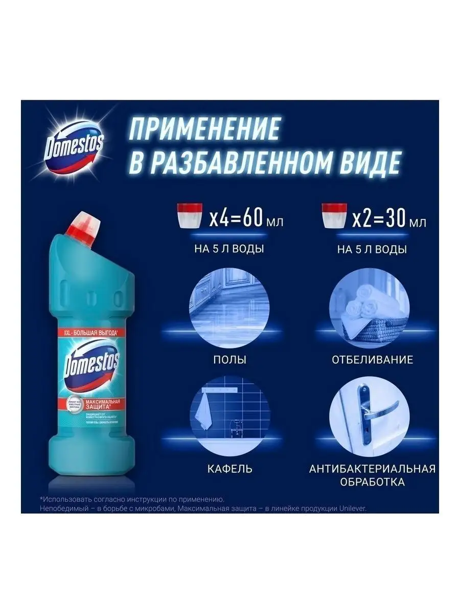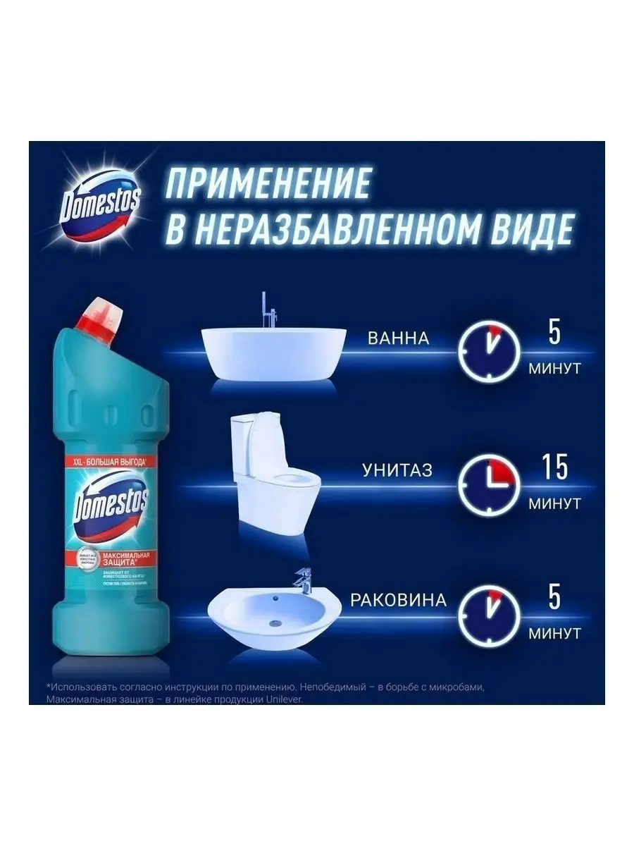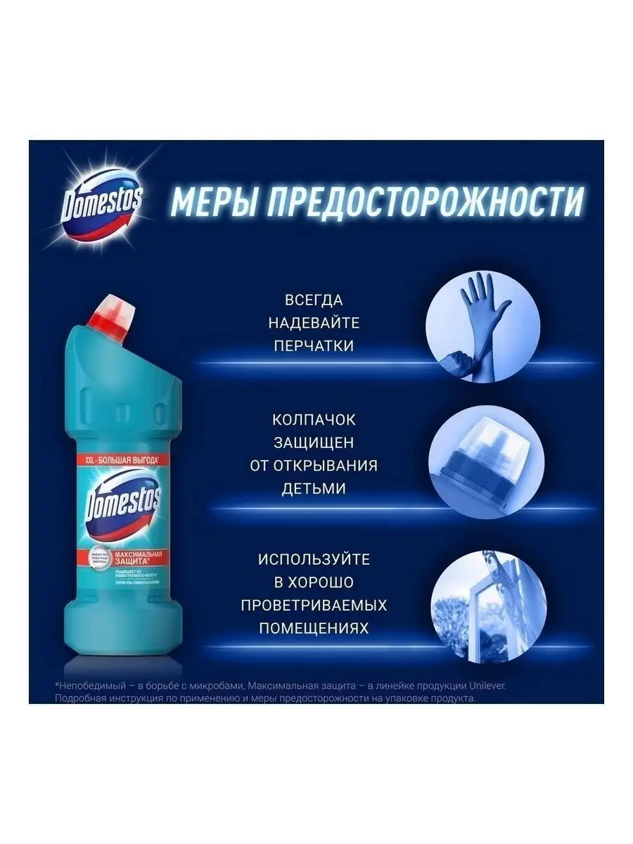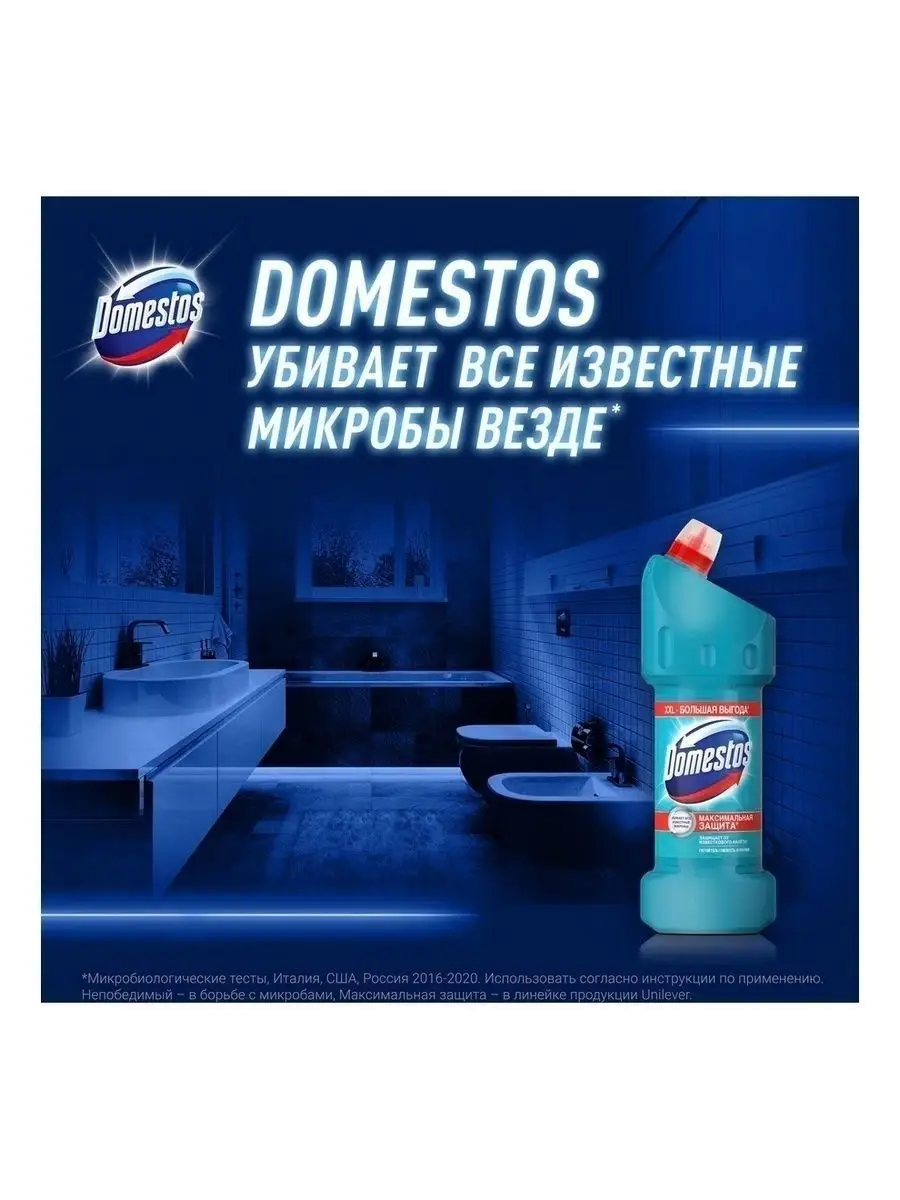Описание: Наше здоровье напрямую зависит от гигиены как в доме, так и за его пределами, особенно это касается туалета. Дезинфицирующие средства Domestos, в составе которых есть мощный антисептик гипохлорит натрия, и другая бытовая химия Domestos максимально очищают поверхности. Средства убивают до 100 % известных вирусов, бактерий, плесени, спор и других видов микробов. Средство чистящее Domestos, 1500 мл — эффективный cleaners-продукт, который поможет поддержать гигиену в доме. Он имеет густую гелевую текстуру, что обеспечивает экономичный расход и 100% защиту от налета. Чистящее средство для туалета универсально и подойдет как для обработки туалета и ванной комнаты, так и для чистки кафеля, дезинфекции раковины и рабочих поверхностей на кухне и во всем доме. В разбавленном виде гель-дезинфектант Domestos можно использовать при мытье полов и для санитарной обработки помещения с целью борьбы с распространением вирусов или бактериальных инфекций. Универсальное средство Domestos максимально очищает любые поверхности и полностью уничтожает неприятные запахи. Благодаря дозатору гель удобно наносится под ободок унитаза и на другие труднодоступные места. За счет активной хлор-формулы Domestos уничтожает опасные вирусы и другие известные микробы, поэтому средство Domestos подходит для эффективной дезинфекции.