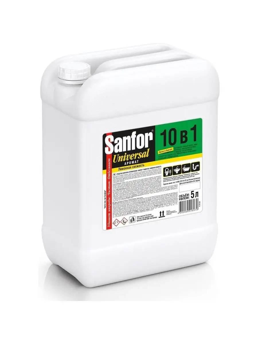 Описание: Универсальное чистящее средство Sanfor Лимонная свежесть гель 5 л. Назначение: универсальный антимикробный гель с хлором предназначен для чистки различных поверхностей в туалете и ванной комнате, на кухне. Подходит для мытья полов и стен, прочистки труб. Легко и быстро устраняет серый налет, грязь плесень, грибок. Убивает микробы и устраняет неприятные запахи. Эффективно отбеливает и дезинфицирует поверхности. Благодаря загущенной формуле, гель расходуется экономично, равномерно распределяется и не стекает с наклонных поверхностей. Флакон оснащен антискользящей поверхностью, его удобно удерживать в руке во время уборки, а также блокиратором крышки для защиты от детей. Способ применения: распределите гель по поверхности с помощью влажной губки. Очистите, смойте водой. Используйте средство только на охлажденных керамических, эмалированных, стальных и других влагоустойчивых твердых поверхностях. Меры предосторожности: перед использованием ознакомиться с маркировкой продукта. Использовать перчатки и средства защиты лица и глаз. Использовать только в хорошо вентилируемом помещении. После работы тщательно вымыть руки. При попадании в глаза: осторожно промыть глаза водой в течение нескольких минут. Снять контактные линзы, если Вы ими пользуетесь и если это легко сделать. Продолжить промывание глаз. Если раздражение глаз не проходит, обратиться за медицинской помощью, по возможности показать маркировку продукта. При возникновении раздражения кожи обратиться за медицинской помощью, по возможности показать маркировку продукта. Хранить в недоступном для детей месте.