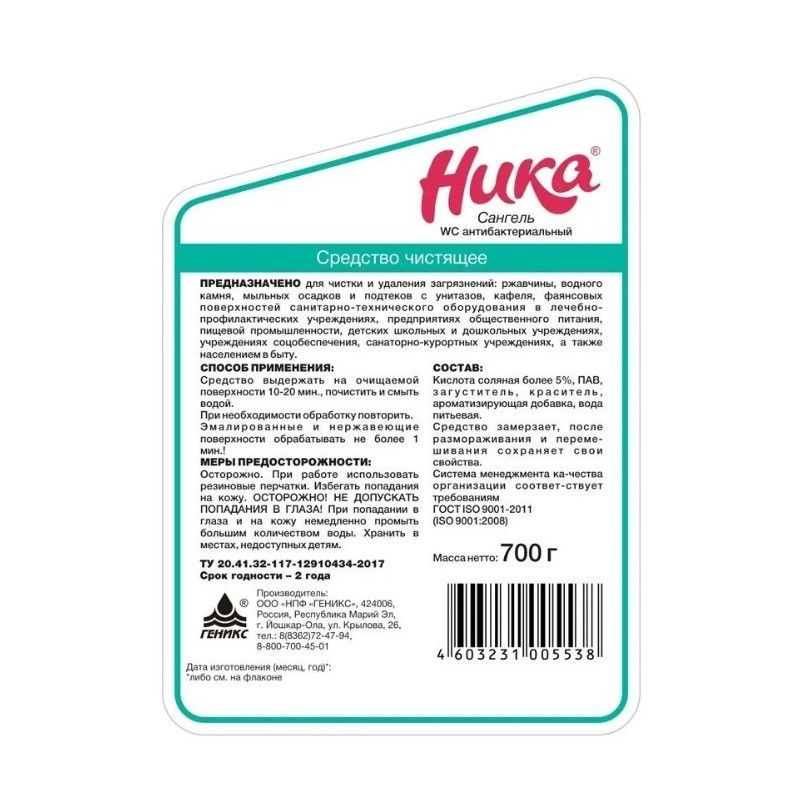 Описание: Средство чистящие «Ника-Сангель» предназначено для чистки унитаза, кафеля, фаянсовых поверхностей санитарно-технического оборудования. Быстро и эффективно удаляет ржавчину, водный камень, мыльные осадки и подтеки, не повреждая обрабатываемые поверхности. А также устраняет неприятные запахи, оставляя аромат сосны в помещении. Убивает микробы. Гелеобразная форма «Ника-Сангель» позволяет экономично расходовать средство. Не содержит хлор! После замерзания сохраняет все чистящие свойства.