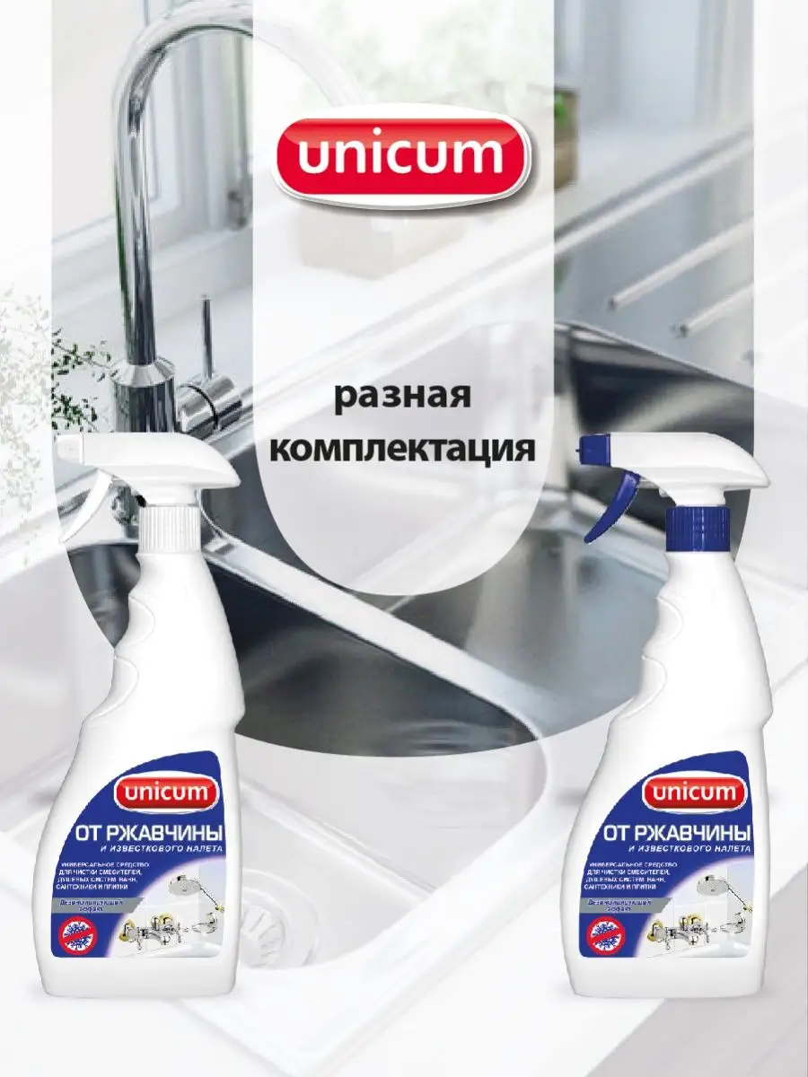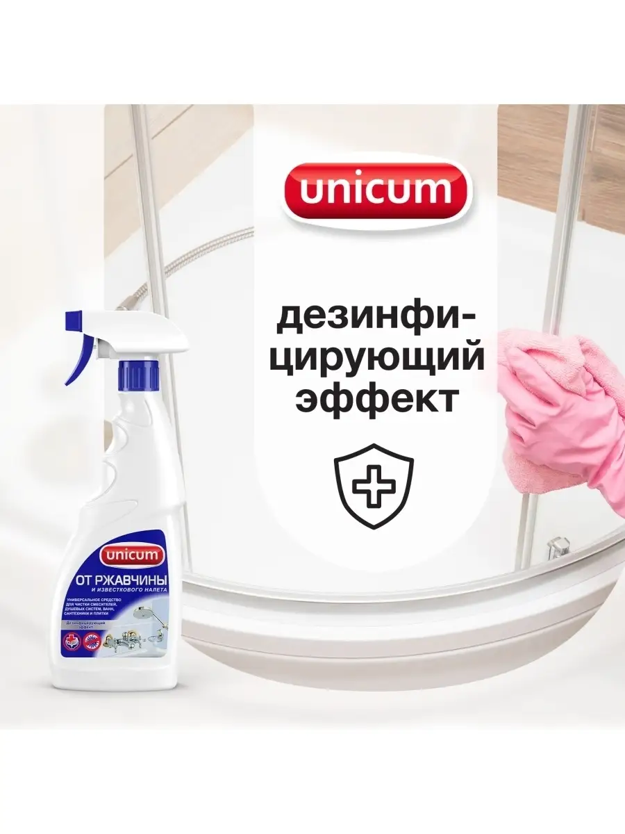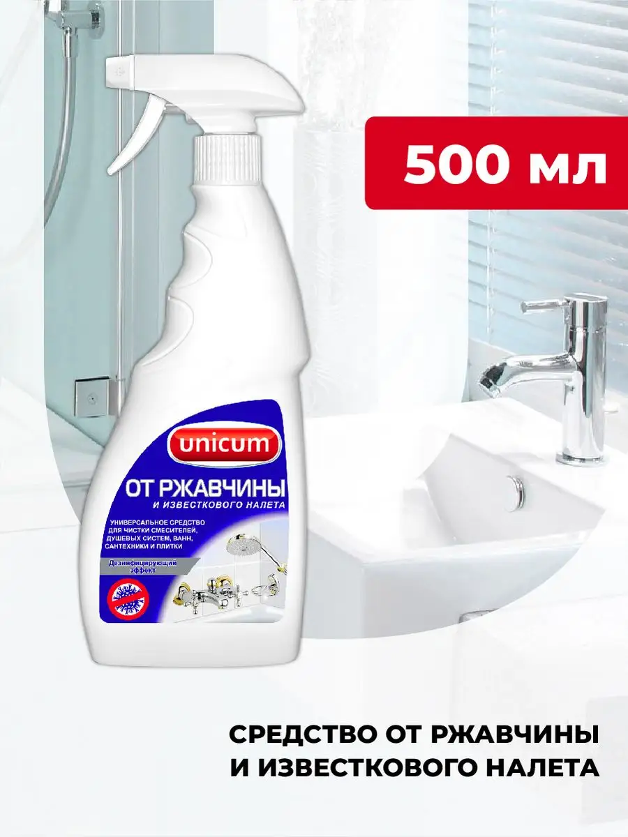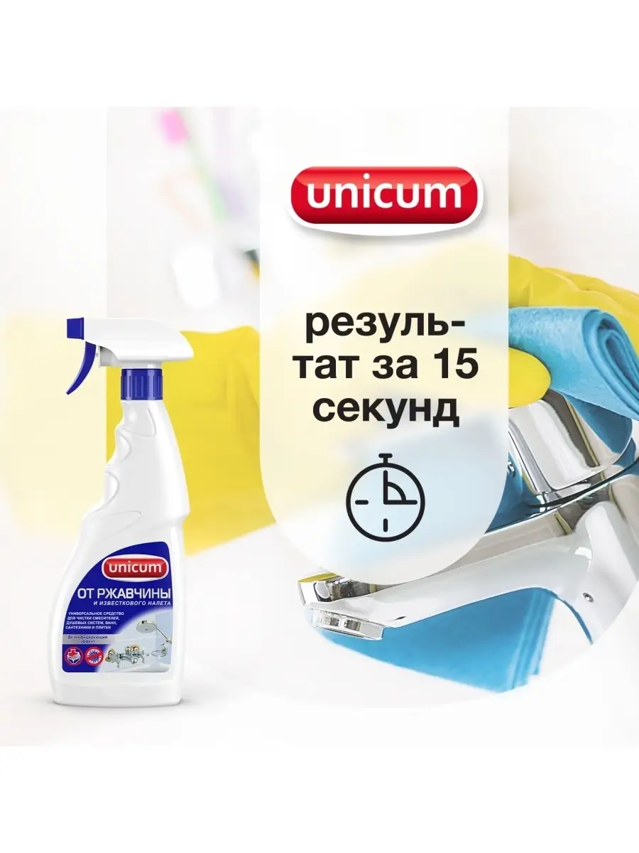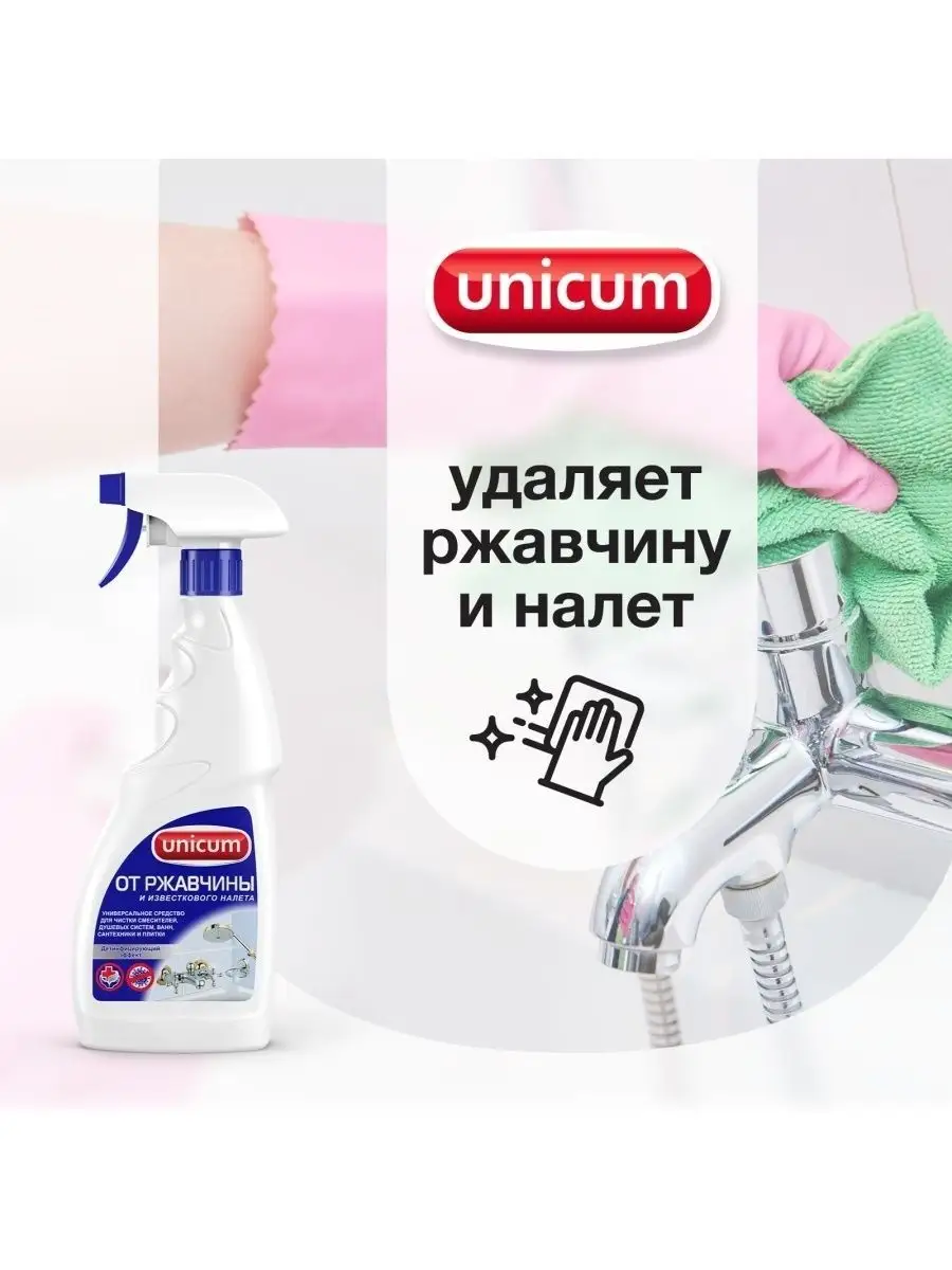 Описание: Быстро удаляет ржавчину и известковый налет. Универсальное средство для чистки смесителей, душевых систем, ванн, сантехники и плитки. Антиржавчина и антиналет. Высокоэффективное средство Уникум для чистки и обновления оборудования ванных и туалетных комнат: эмалированной и фарфоровой сантехники, изделий из нержавеющей стали, унитазов биде, раковин, кафельных покрытий и пластиковых панелей. Средство мгновенно удаляет следы мыла, известковый налет ржавчину, мочевой камень плесень и грибок. Удаляет неприятные запахи придает блеск и оставляет защитный слой препятствующий последующим загрязнениям. Обладает легким ароматом весенней зелени. СПОСОБ ПРИМЕНЕНИЯ: нанести средство с помощью распылителя с расстояния 20-25 см на очищаемую поверхность, подождать 15-20 секунд, протереть щеткой или тряпкой и смыть водой. В случае особо стойких загрязнений - повторить действие, увеличив время обработки до 1 мин. Для удаления загрязнений рекомендуется использовать рулонные тряпки торговой марки Unicum. ВНИМАНИЕ!!! Данный товар поставляется в бутылке с закрытой крышкой во избежание протечки. Распылитель «триггер» поставляется также в комплекте. БУДЬТЕ ВНИМАТЕЛЬНЫ!!! Вскрывать упаковку с товаром аккуратно, чтобы не повредить трубку распылителя ножом или ножницами. Для использования товара нужно открутить крышку с бутылки и прикрутить распылитель. При сложности в откручивании крышки, проколоть крышку сверху и открутить.
