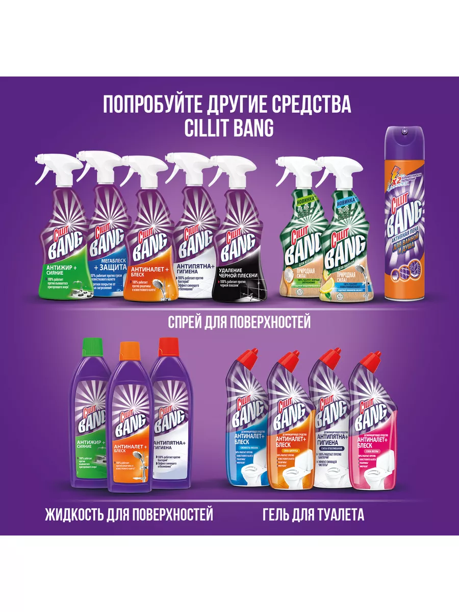Описание: Мощное средство СILLIT Bang Мегаблеск + Защита(с курком), 450 мл.Эффективно удаляет грязь, мыльные разводы и известковый налет. Специальные компоненты, входящие в состав средства, создают невидимое защитное покрытие, которое предотвращает появление новых загрязнений уже после первого применения.теги:моющее средство для ванной и кухни, средство для уборки универсальное