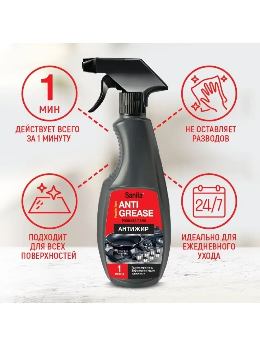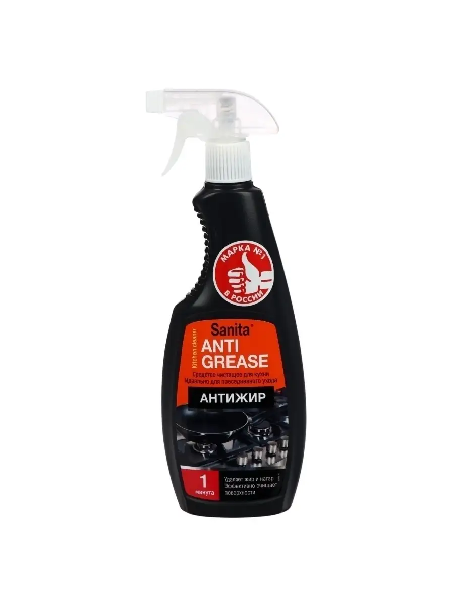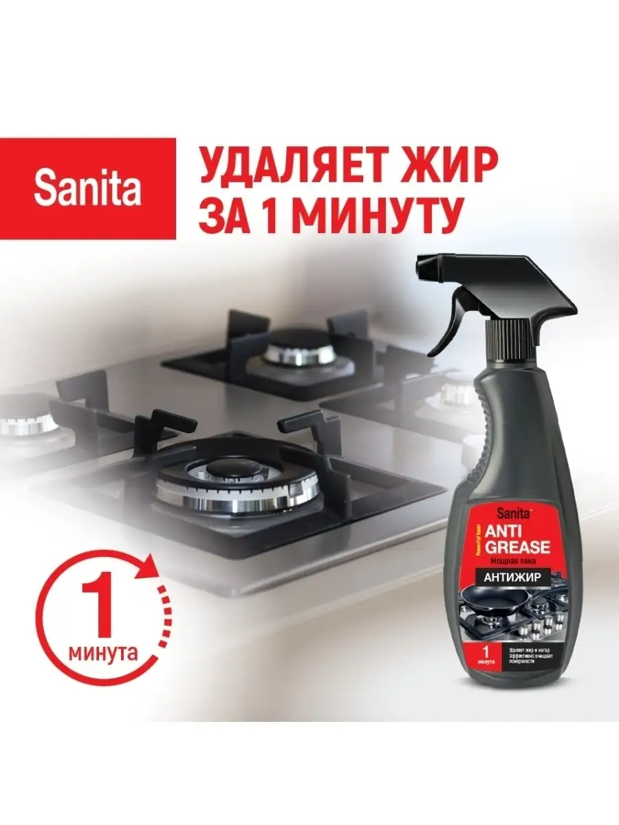 Описание: Спрей для кухни Sanita 1 минута универсальное средство для кухонных поверхностей. Эффективно удаляет жир, нагар и въевшуюся грязь.Хорошо удерживает и растворяет загрязнения на вертикальных поверхностях и в труднодоступных местах.