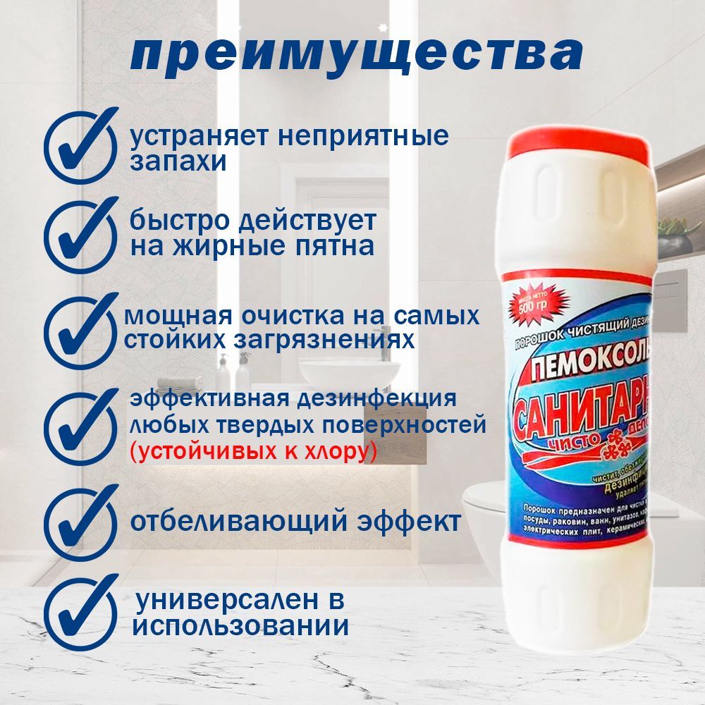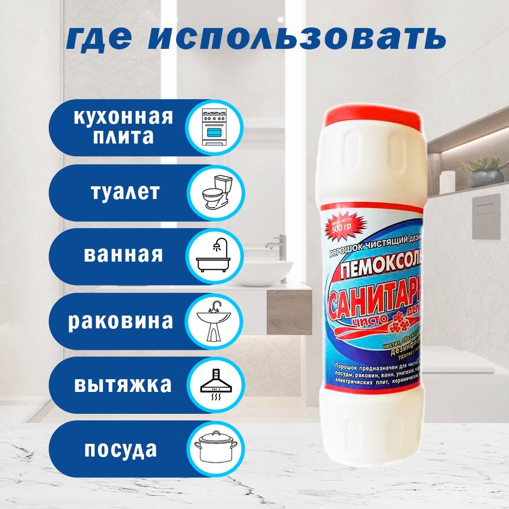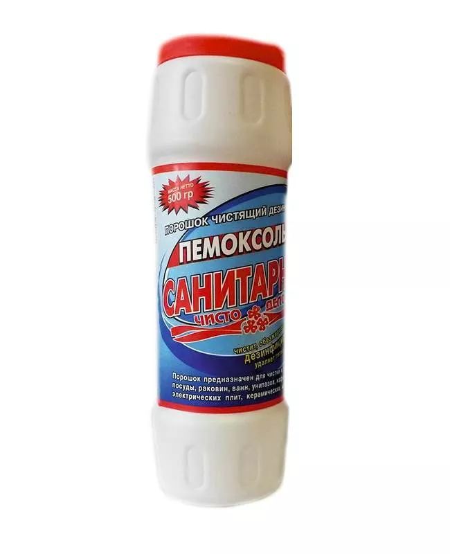 Описание: Чистящее средство универсальное Пемоксоль, чистящий порошок, банка 500 гр, Санитарный с хлоромЧистящее средство универсальное Пемоксоль, чистящий порошок, банка 500 гр, Санитарный с хлором. Универсальное чистящее средство Пемоксоль Санитарный с Хлором предназначено для эффективного очищения кухонных принадлежностей, ванн, раковин, унитаза и кафеля. Чистящие гранулы удаляют жир, ржавчину, мыльный налет и любые загрязнения без повреждения поверхности. Универсальный чистящий порошок чистит, обезжиривает, отбеливает, удаляет неприятные запахи. Активные компоненты придают Вашей сантехники белизну и блеск, оставляя свежий аромат после уборки. Чистящий порошок Пемоксоль с Хлором достаточно нанести на загрязненную поверхность, оставить на несколько минут, затем, с помощью губки смыть водой. ... Подарите Вашему дому чистоту и уют, используйте Пемоксоль с Хлором. Порошкообразное чистящее средство для кухни Пемоксоль-Санитарный, содержащее хлоринол и абразивный компонент на меловой основе, удаляет пятна внутри поверхности. Чистящий порошок "Пемоксоль-Санитарный" это: * Эффективная дезинфекция любых твердых поверхностей (устойчивых к хлору) * Мощная очистка поверхностей от самых устойчивых загрязнений * Быстрое и эффективное очищение от ржавчины и известкового налета * Дезодорация поверхностей и помещений. Чистящее средство Пемоксоль имеет мягкую абразивную формулу.  Достоинства чистящего порошка Пемоксоль: экологичность состава - изготовлен на основе молотого мрамора и соды. Доля АПАВ составляет 5 %.  Состав : >30% мрамор молотый, >5% но <15% сода, хлорсодержащий агент, <5% АПАВ, фосфаты, отдушка ТУ 2383-001-33523813-2005 СГР RU.40.01.05.015.Е.001280.02.12 Меры предосторожности: не применять для полирования алюминия, применять для любых твердых поверхностей устойчивых к хлору. Хранить в сухом , недоступном для детей месте. При попадании в глаза промыть водой. Срок годности 24 месяца с даты изготовления см. на упаковке. Чистящий порошок Пемоксоль, имеет не дорогую стоимость, при этом это эффективное чистящее средство, что делает покупку приятной и практичной.