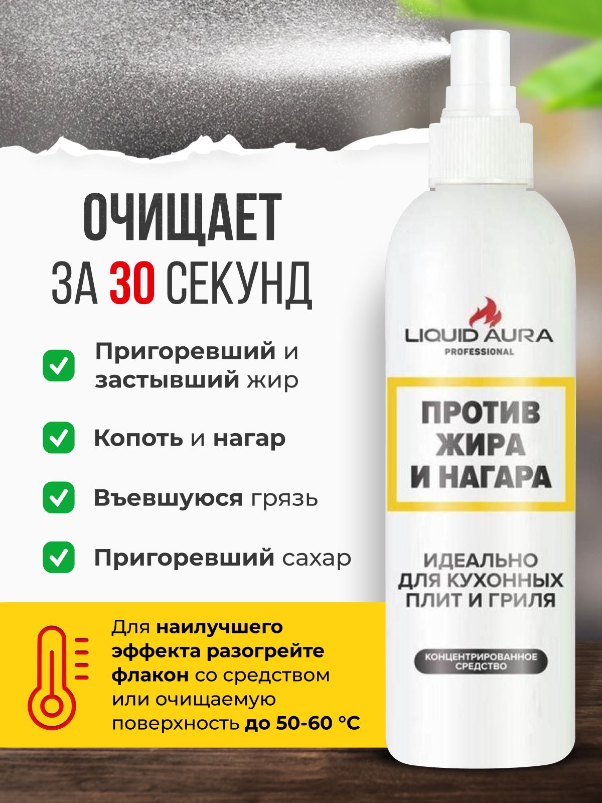 Описание: Универсальное эффективное средство для кухни от жира и нагара Liquid Aura - ваш идеальный помощник, который без труда избавит вас от въевшегося застарелого жира, нагара, копоти и пригоревшей пищи на эмалированных, хромированных, стеклянных, стеклокерамических, нержавеющих стальных, фаянсовых и фарфоровых поверхностях. Антижир поможет вам легко и быстро помыть и почистить сковородки, плиты, коптильные камеры, фритюрницы, грили, духовые шкафы, микроволновые печи и другие поверхности. Одно из главных преимуществ чистящего средства Liquid Aura - это его уникальная формула, которая быстро и эффективно удаляет даже самые стойкие загрязнения. Кроме того, вы не будете беспокоиться о расходе данного продукта, так как он экономичен в использовании. Универсальное эффективное средство для кухни от жира и нагара - лучший выбор для тех, кто хочет получить чистую и ухоженную кухню, не тратя много времени и усилий.