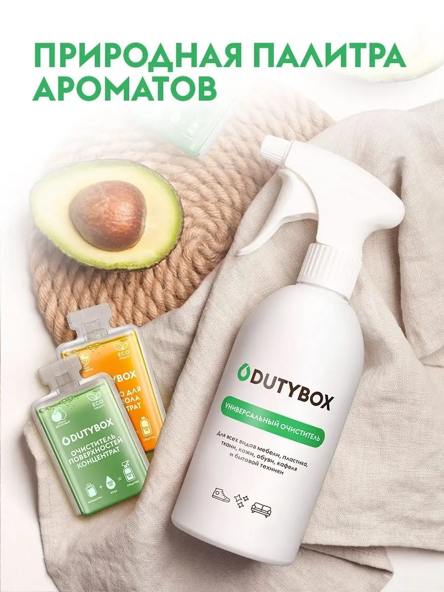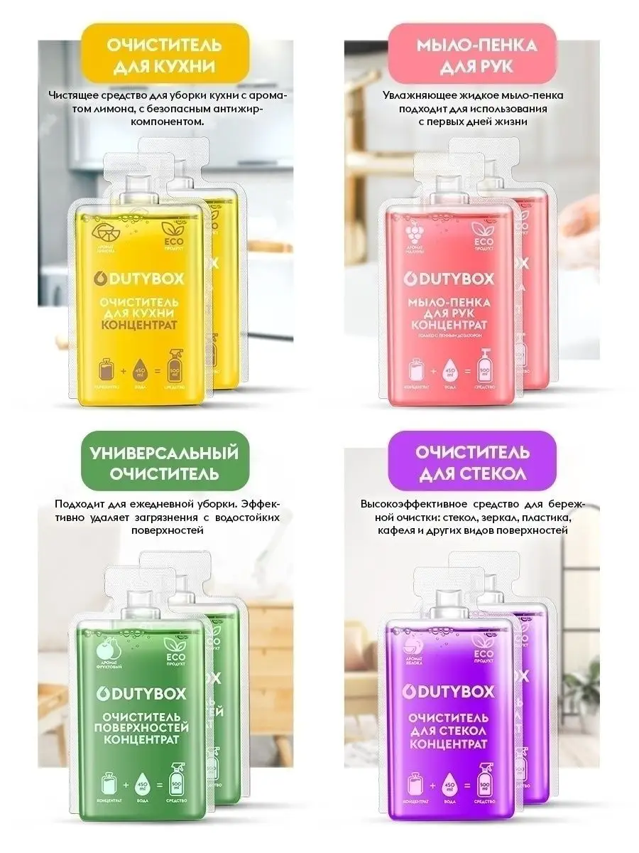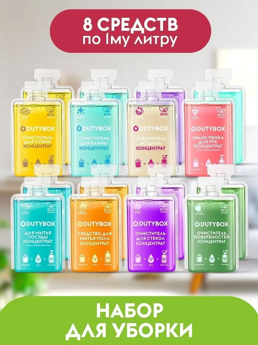 Описание: Набор средств для уборки дома. 8 концентратов для разведения Дьютибокс. 8 средств по 1 литру самого необходимого для уборки. Концентрат 50мл необходимо разбавить с 450 мл воды в бутылке с триггером, пенным дозатором, согласно инструкции. Многоразовые ёмкости вы можете приобрести в наборе Арт 11727403. Состав набора концентратов: 1. Средство для мытья пола 1л;2. Средство для мытья посуды, овощей, 0+, 1л;3. Мыло для рук, 0+, 1л: аромат малины 500мл + аромат шалфея и мяты 500мл; 4. Средство для мытья стёкол и зеркал 1л; 5. Чистящее средство для кухни антижир, для варочных поверхностей, кухонных шкафов, СВЧ, фартуков и др. 1л;6. Средство для уборки ванной комнаты, 1л. Для сан.узла, для чистки акриловых раковин ванн. Удаляет налет, мыльные подтеки. 7. Универсальное чистящее средство 1л, Для пластика, кожаной мебели, а также, для ухода за салоном автомобиля; 8. Освежитель воздуха, ароматизатор для дома: аромат орхидея 500мл, аромат древесно-цитрусовый 500мл.