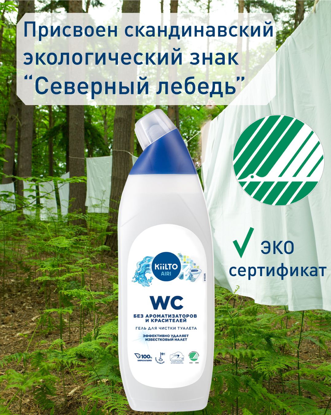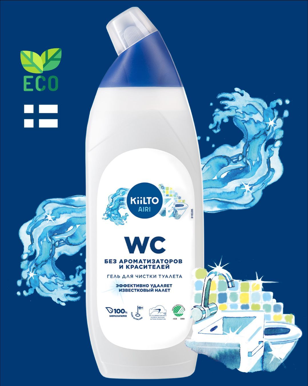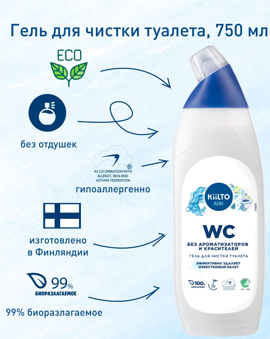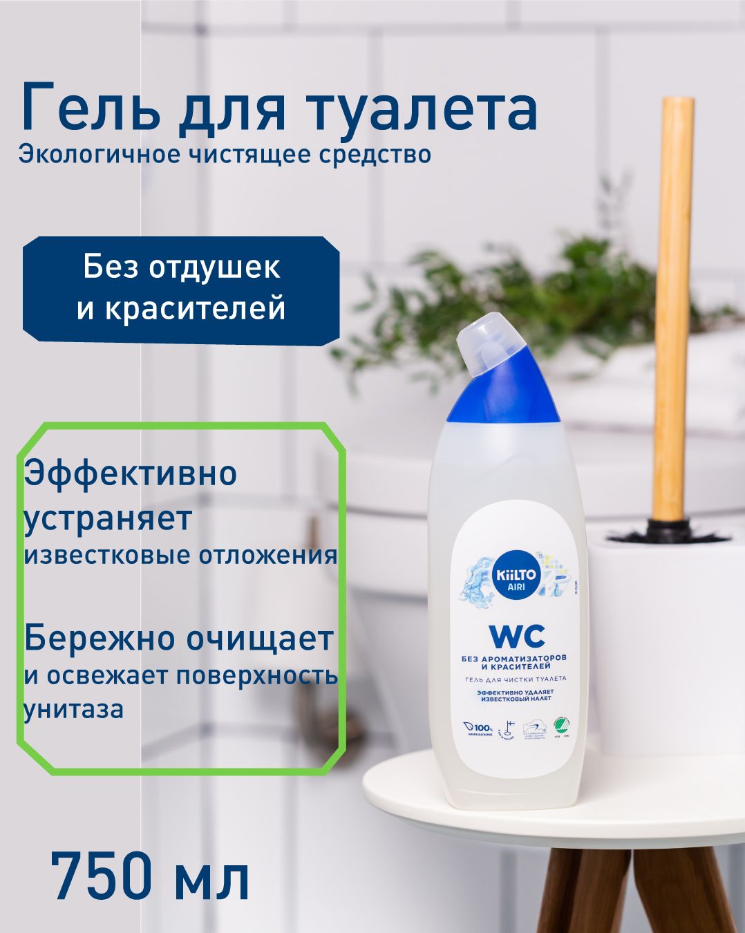 Чистящий ЭКО-гель KIILTO, для туалета, без хлора и фосфатов, без отдушек, гипоаллергенный,750 мл