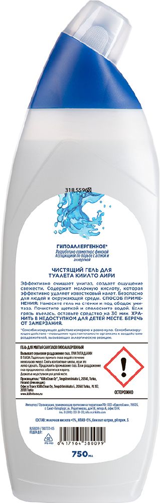 Чистящее средство-гель для очистки туалета KIILTO, гипоаллергенное, 750 мл, 1 шт.