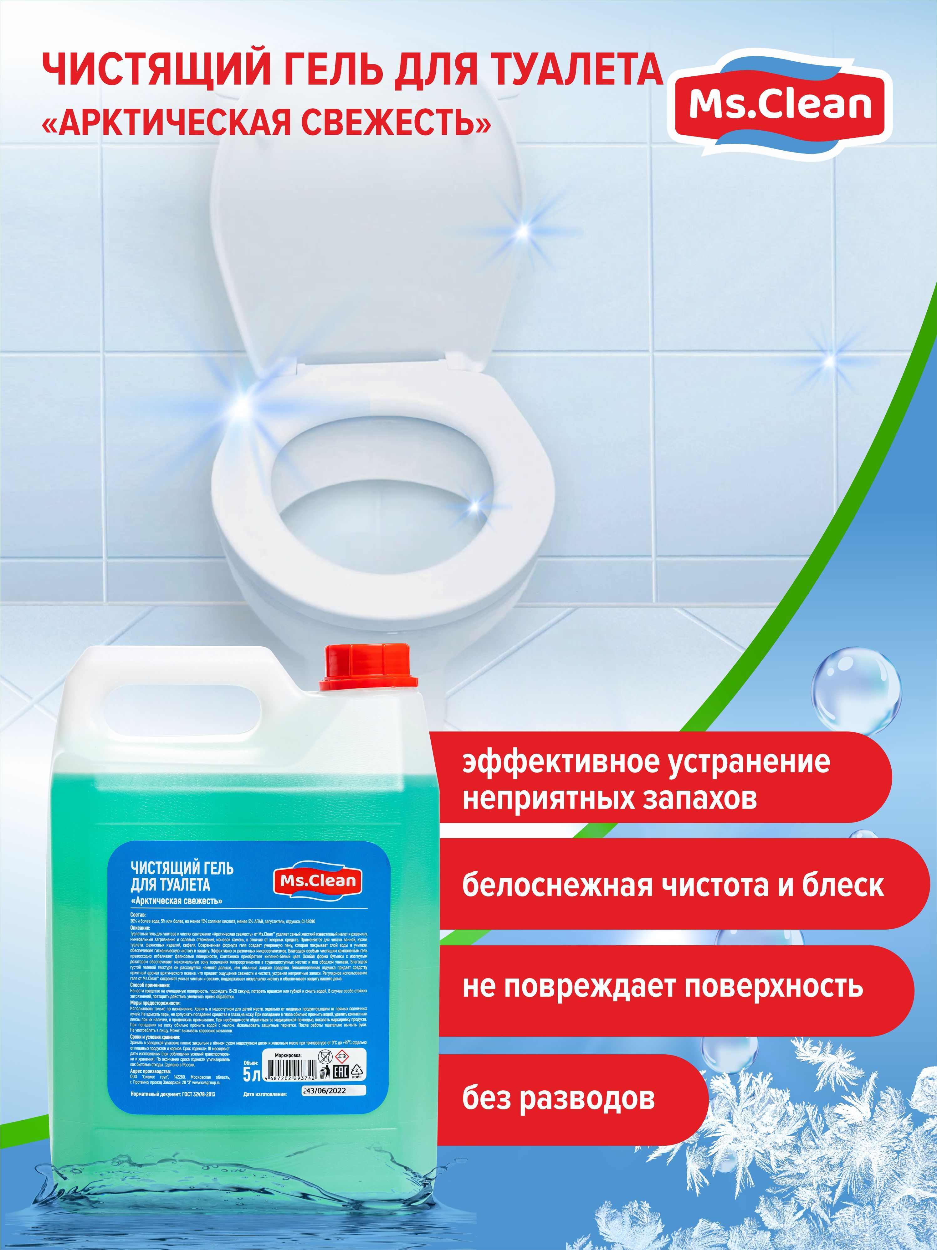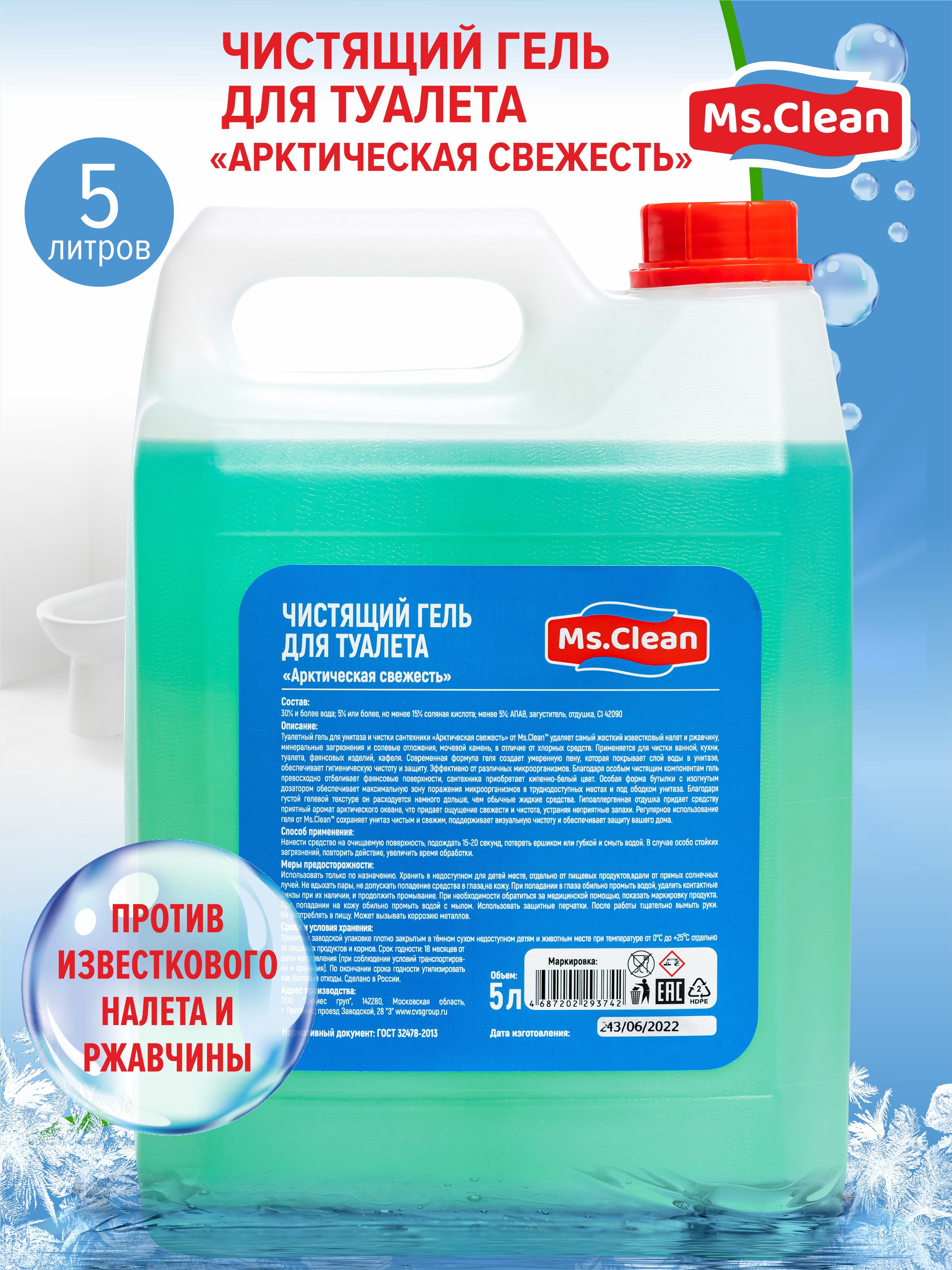 Описание: Универсальный гель для туалета унитаза чистки сантехники Арктическая свежесть от Ms.Clean удаляет самый жесткий известковый налет и ржавчину, минеральные загрязнения и солевые отложения, мочевой камень, потеков ржавчины. Применяется для чистки ванной, кухни, туалета, фаянсовых изделий, кафеля, биде, писсуаров и всех видов кафельных и мозаичных поверхностей. Аромат свежести, способствует устранению неприятного запаха. Чистящее средство для унитаза создает умеренную пену которая покрывает слой воды в унитазе, обладает дезинфицирующим эффектом обеспечивает гигиеническую чистоту и защиту от бактерий. Эффективно от 99,9% микробов, гель отбеливает фаянсовые поверхности, приобретает кипельно белый цвет. Благодаря гелевой текстуре он расходуется намного дольше чем жидкие средства. Благодаря туалетному ершику или губке он справится с устранением микробов, бактерий, соляных отложений с поверхностей. Миссис клин помощник для ежедневной уборки дома в повседневной жизни. Бытовая химия для уборки дома поможет поддержать ежедневную чистоту без лишних усилий. Ms.Clean российское производство бытовой химии чистящие средства, хозяйственные товары для уборки. Также можете приобрести средства и в канистре 5 л. Приобретая чистящие и моющие средства от Миссис Клин, подарите себе уют и комфорт в доме.