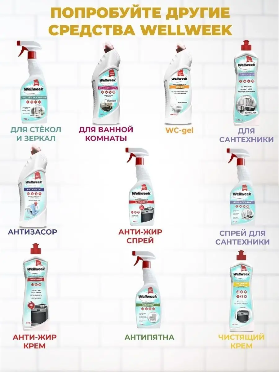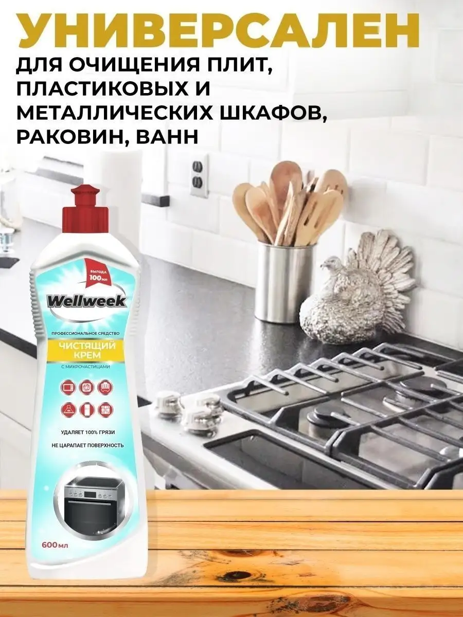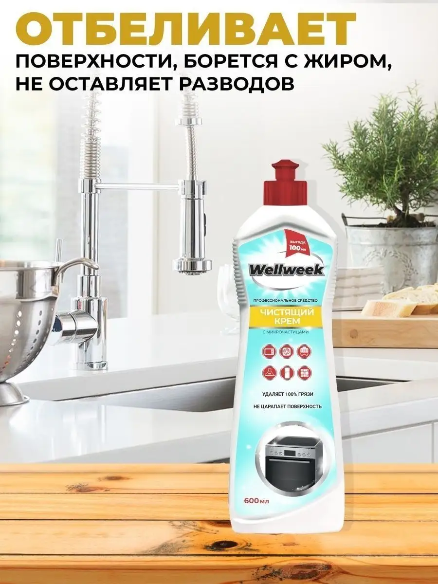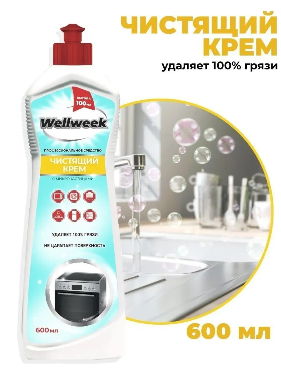Описание: Чистящий крем от Wellweek предназначен для очищения плит, стеклокерамических варочных поверхностей, пластиковых и металлических изделий, моек, духовых шкафов, стеклокерамических плит. Универсальное чистящее средство идеально для очищения раковины, ванны, смесителей. Чистящий крем легко убирает различные стойкие загрязнения - жир, нагар, копоть, пригоревший сахар. Крем для уборки незаменим на кухне, тк не останется и следа от чая, кофе, вина, соков, овощей, фруктов, травы и цветов. Средство для кухни так же легко справляется со следами масел, смол, мазута, пятен растительного происхождения. Благодаря микро гранулам, крем для уборки дома обеспечивает легкий абразивный эффект, не царапая поверхность! Крем как кр азелит в ювелирных изделиях придаст блеск Вашему дому. Универсальное средство для уборки легко смывается при этом наполняет дом приятным свежим ароматом. Крем от Вэлвик грасс мейстер среди всех кремов. Бытовая химия от Wellweek будет приятным подарком маме, жене, подруге, дочери. Состав: ≥30% вода; ≥15%, но <30% абразив; <5%: нПАВ, глицерин, щелочь, соль ЭДТА, ароматизатор, консервант