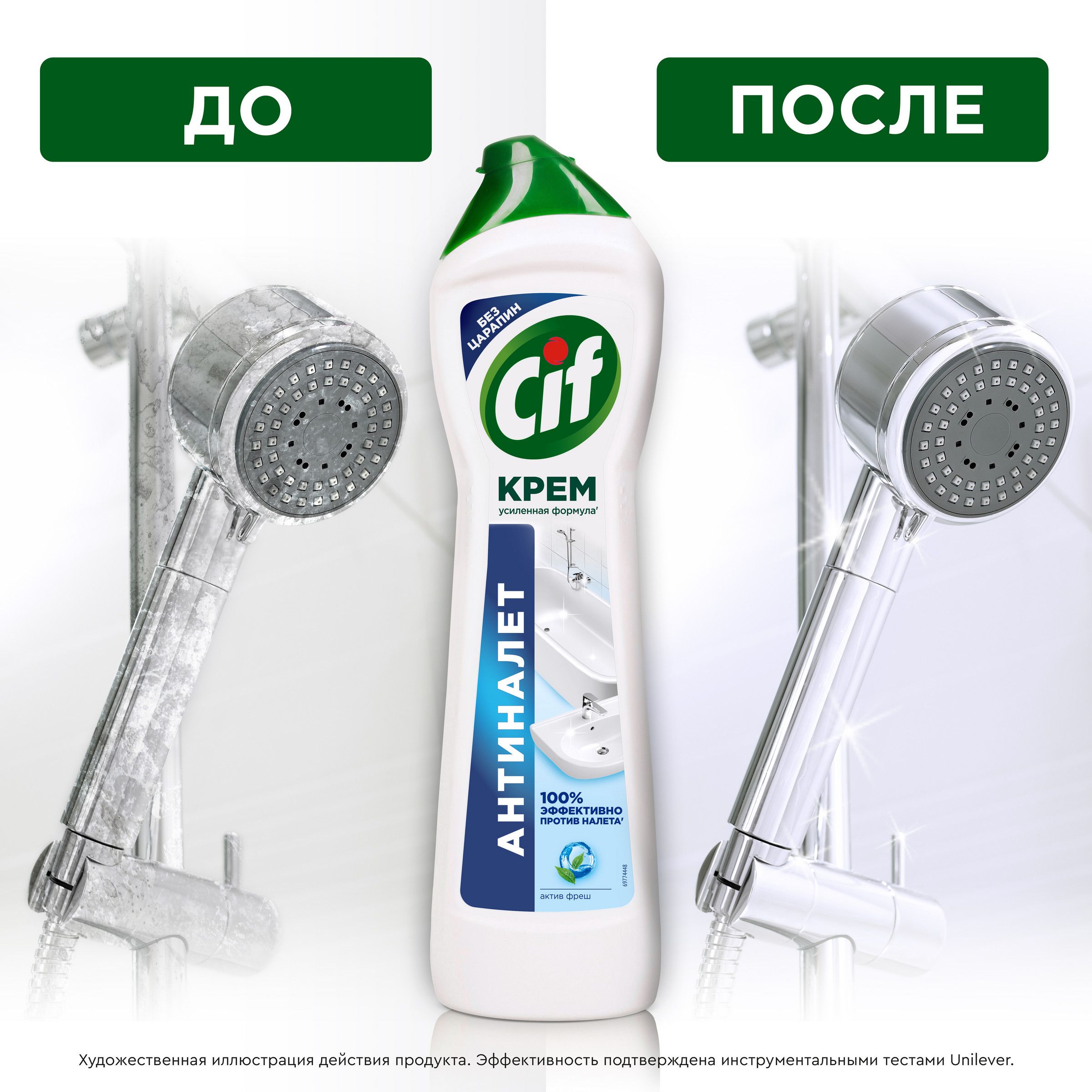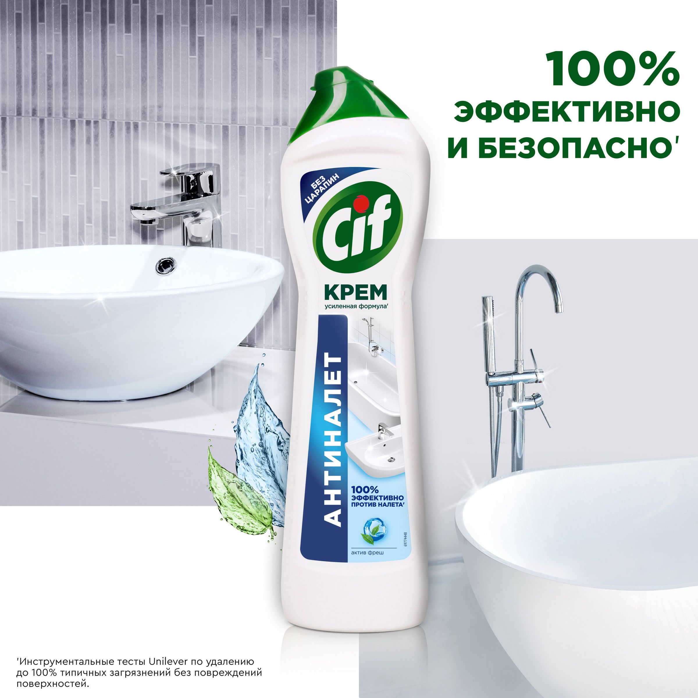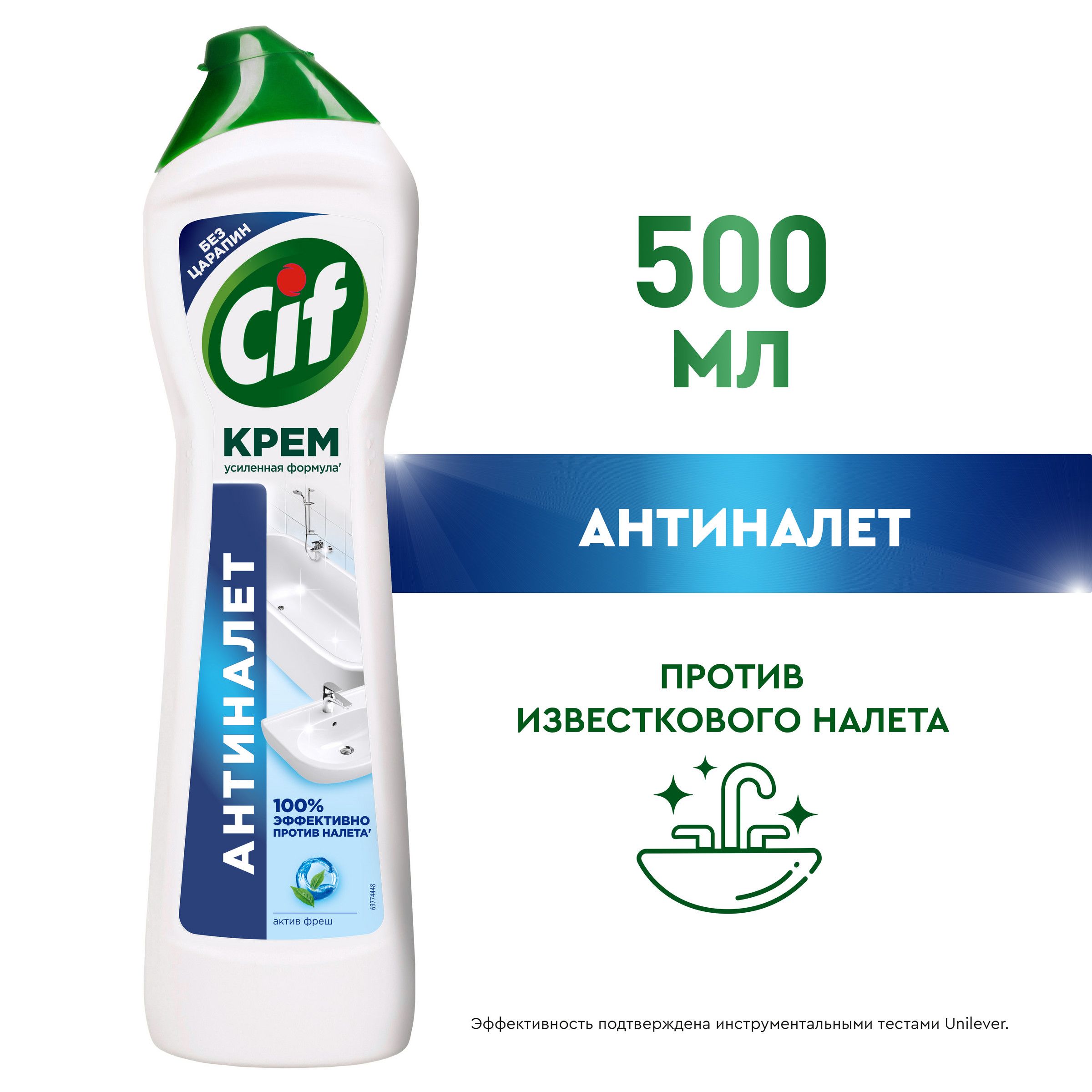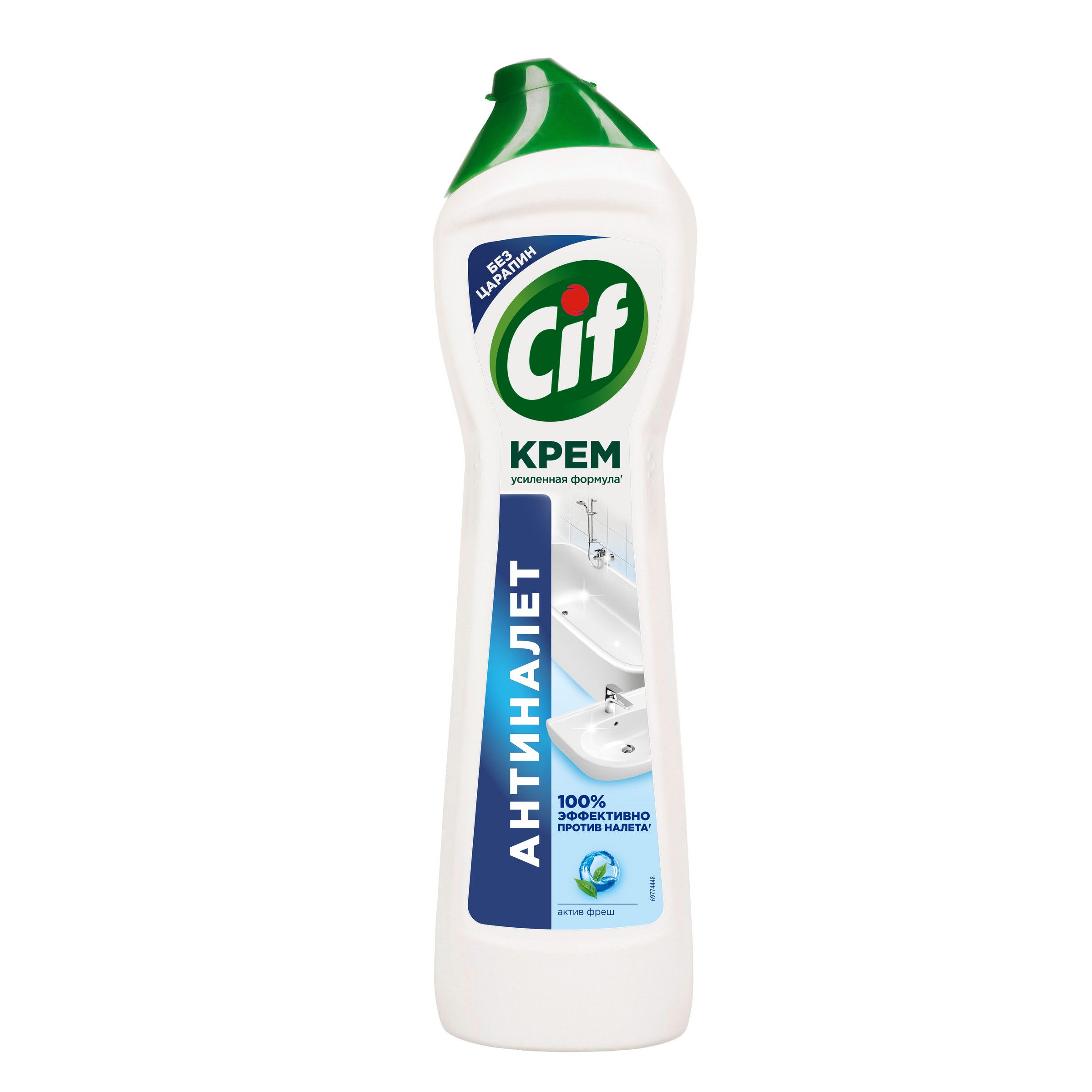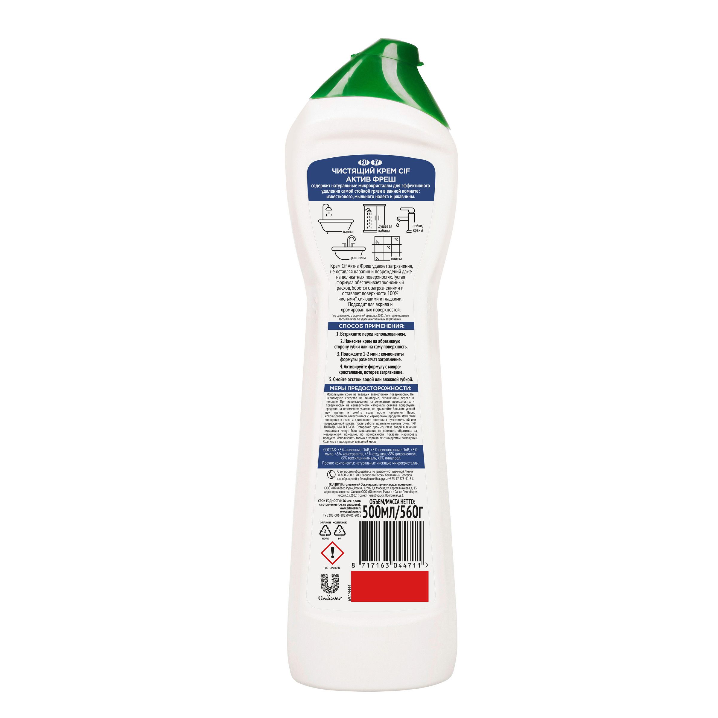 Описание: Чистящий крем для ванны Cif Антиналет — ваш личный помощник по уборке в ванной комнате. Он знает, как удалить даже самые стойкие загрязнения, в том числе известковый и мыльный налет, а также ржавчину. То, что нужно, чтобы быстро привести в порядок сантехнику, стереть разводы на кафеле, вернуть блеск хромированным элементам и эмали. Его усиленная формула' с натуральными микрокристаллами легко удаляет 100% налета" и других стойких загрязнений. Для эффективной и быстрой уборки ванной комнаты нанесите чистящий крем Cif Антиналет на поверхность при помощи губки или прямо из флакона. Подождите 1-2 минуты: за это время усиленная формула крема растворит загрязнение, проникая в его структуру. Потрите поверхность абразивной стороной губки, чтобы активировать микрокристаллы в составе и удалить загрязнение без следа. Густая текстура крема равномерно распределяется и обеспечивает экономичный расход средства. Ваш комфорт во время уборки — важная часть нашей работы. Формула Cif без резкого запаха безопасна не только для поверхностей, на которых используется, но и для человека. Мы знаем, как это важно для тех, кто заботится заботится о красоте дома и здоровье семьи. Сиф Актив Фреш позаботится о том, чтобы поверхности в вашей ванной комнате сияли чистотой. Используйте его для акрила, металла (в том числе хромированного), стекла, эмалей и керамики. Мягкий чистящий крем с натуральной чистящей основой''' не оставляет царапин даже на самых деликатных поверхностях. С кремом Сиф Антиналет проще находить время на то, что действительно нравится! 'по сравнению с формулой средства 2021г. "инструментальные тесты Unilever по удалению типичных загрязнений. '''натуральные чистящие микрокристаллы