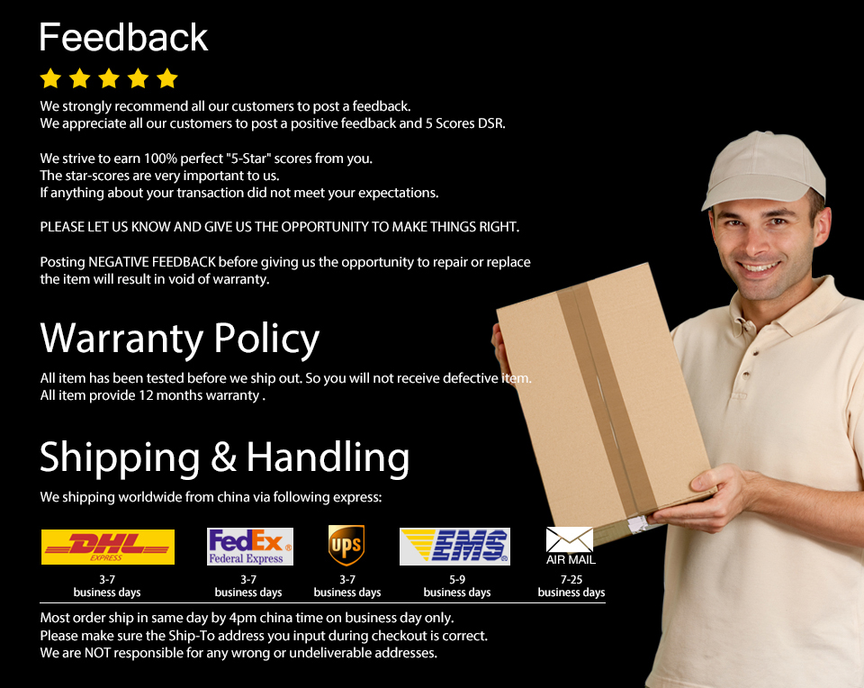 3. Мы обещаем гарантию качества в течение одного года и отремонтируем его бесплатно. Возвратные почтовые расходы должны быть оплачены покупателем.