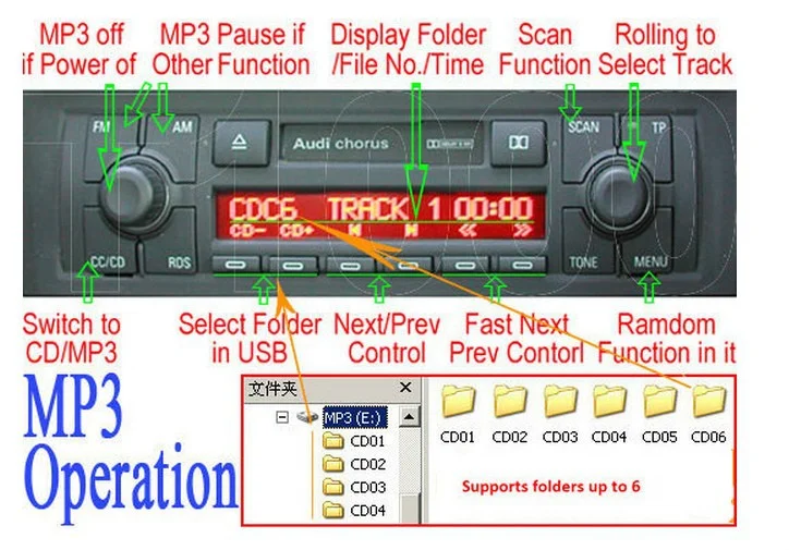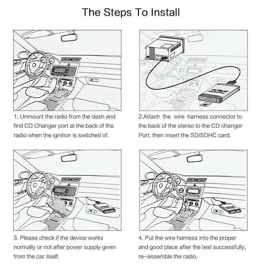 Это автомобильный комплект Audio. Это Замена CD-чейнджера. Его можно легко установить и использовать. Установка и использование такие же, как установка и использование CD-чейнджера. Просто Подключите USB-диск/SD-карту, вы можете воспроизводить звук через автомобильную аудиосистему и наслаждаться музыкой в своем автомобиле.