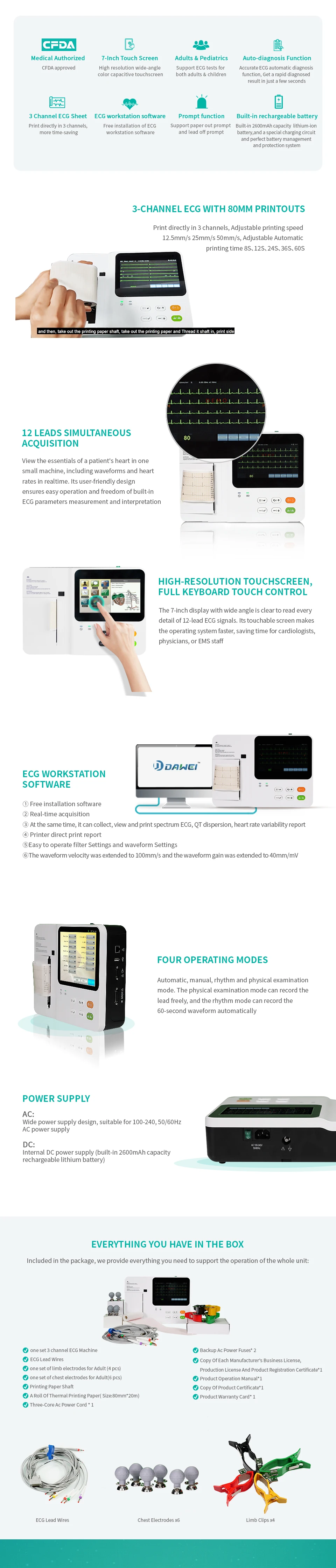 Четыре режима работы: автоматический, ручной, ритмический и физический режим осмотра. Режим физического осмотра может свободно записывать провод, а режим ритма может автоматически записывать 60-секундную форму сигнала.