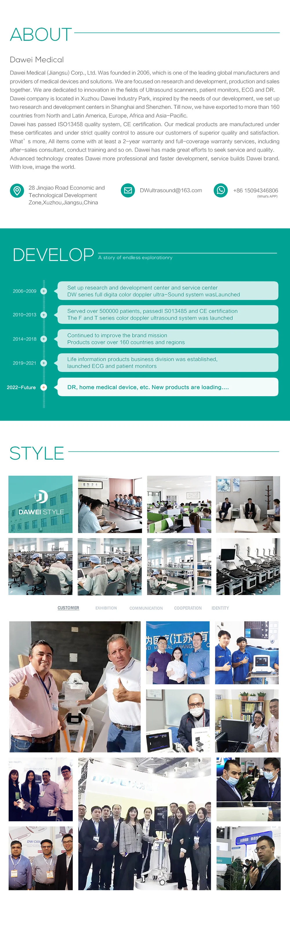 Компания DAWEIMedical (Jiangsu) Corp., Ltd. была основана в 2006 году и является одним из ведущих мировых производителей и поставщиков медицинских приборов и решений. Мы сосредоточены на исследованиях и разработках, производстве и продажах вместе. Мы стремимся к инновациям в области ультразвуковых сканеров, мониторов пациентов, ЭКГ и ДР.