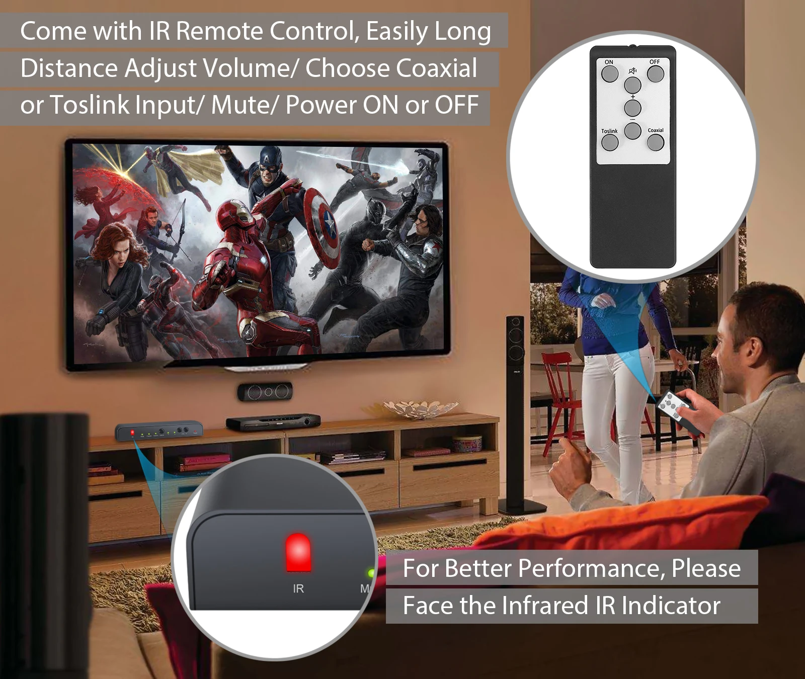 ИК-пульт дистанционного управления позволяет легко регулировать громкость/выбирать коаксиальный или toslink вход/отключение звука/включение или выключение питания.