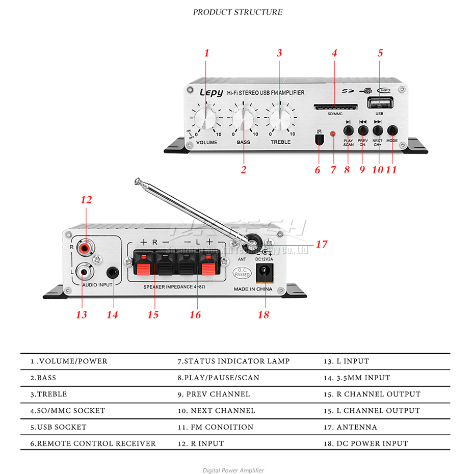 Универсальная функция аудиовхода делает его совместимым с DVD, CD, MP3, SD, USB, FM, другими аудио приложениями, дает вам удовольствие от музыки высокого качества.
