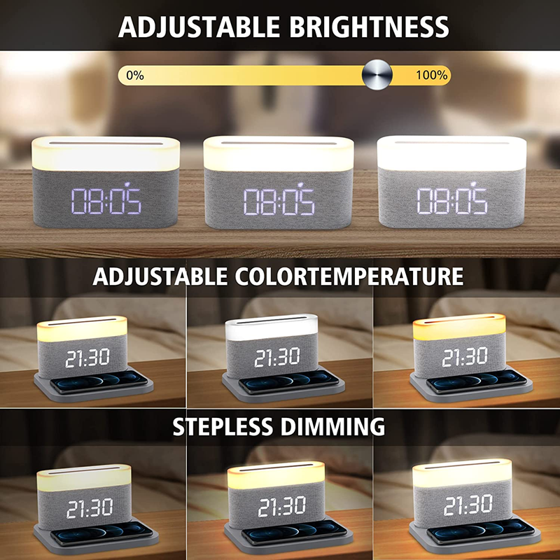 Цифровой будильник Светодиодный ночник Беспроводная зарядка 15 Вт Сенсорная прикроватная лампа Регулируемая яркость QI Беспроводное зарядное устройство Спальня