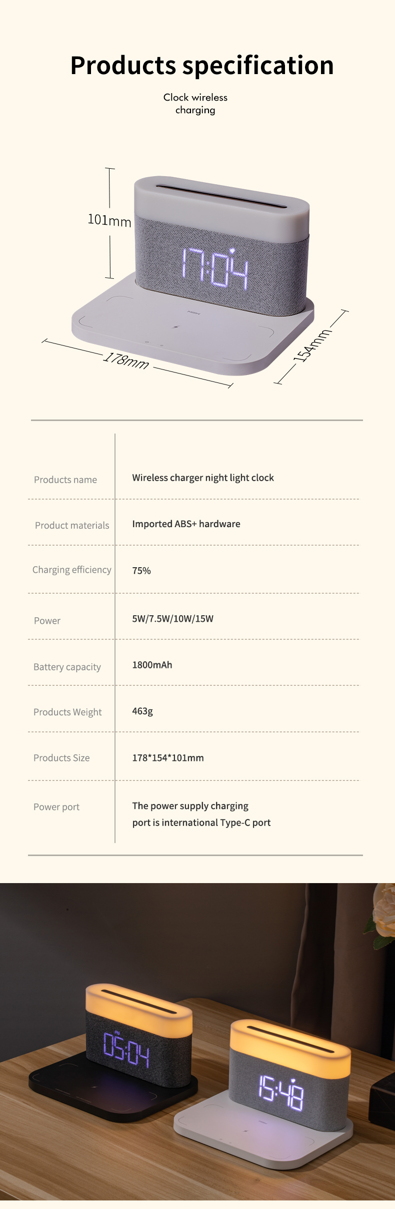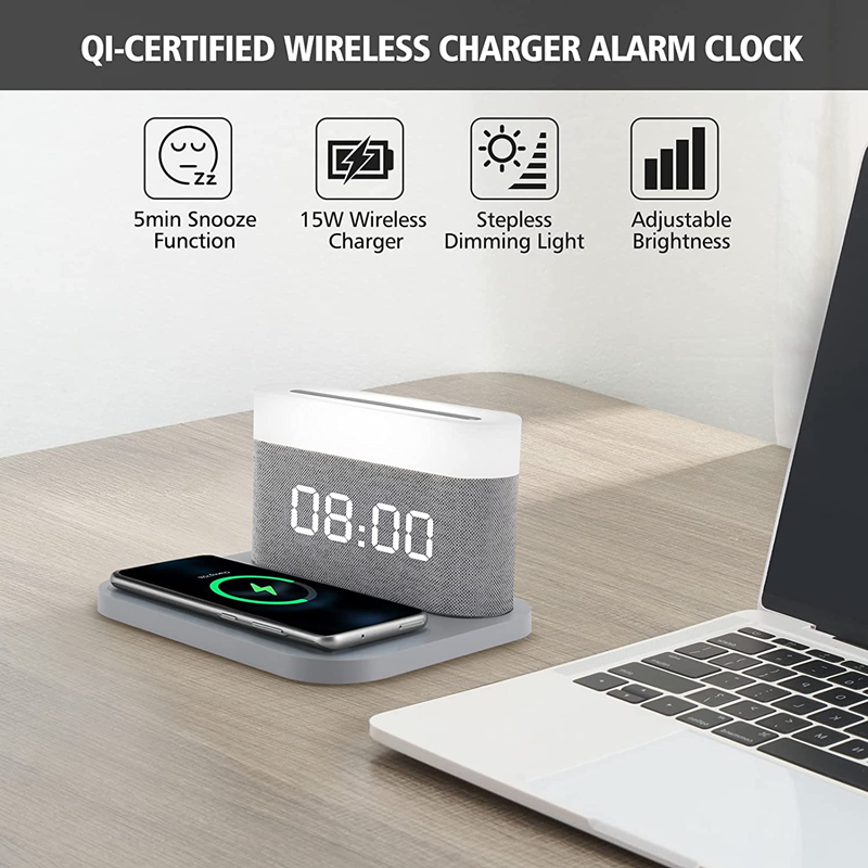Цифровой будильник с беспроводной зарядкой, 15 Вт