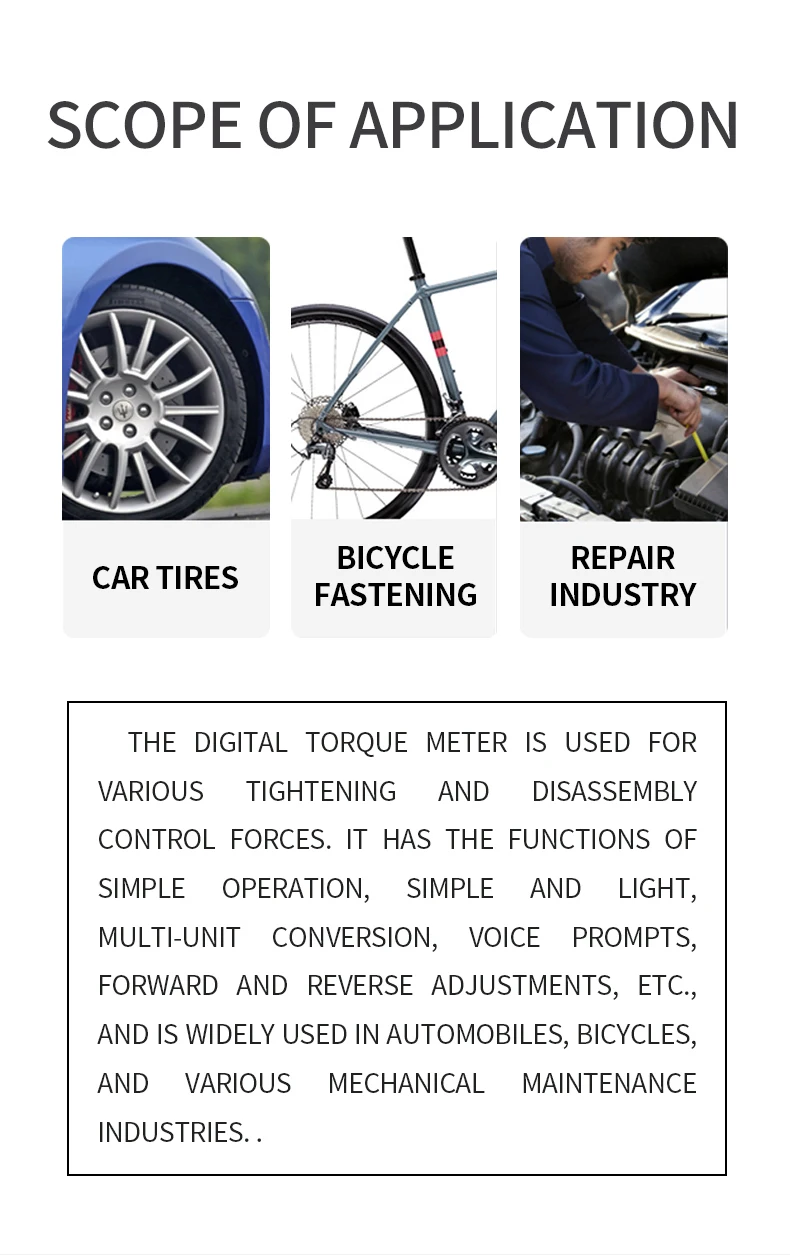 Цифровой дисплей torque meter-это инструмент для мониторинга крутящего момента, соответствующий трещоточному ключом, который используется для различного крепления и демонтажа сил управления. Он имеет функциональные характеристики простой работы, портативной переноски, мульти-единицы преобразования, звуковой индикации, регулировки вперед и назад и т. Д. Он широко используется в автомобилях, велосипедах, различных отраслях механического обслуживания и т. д.
