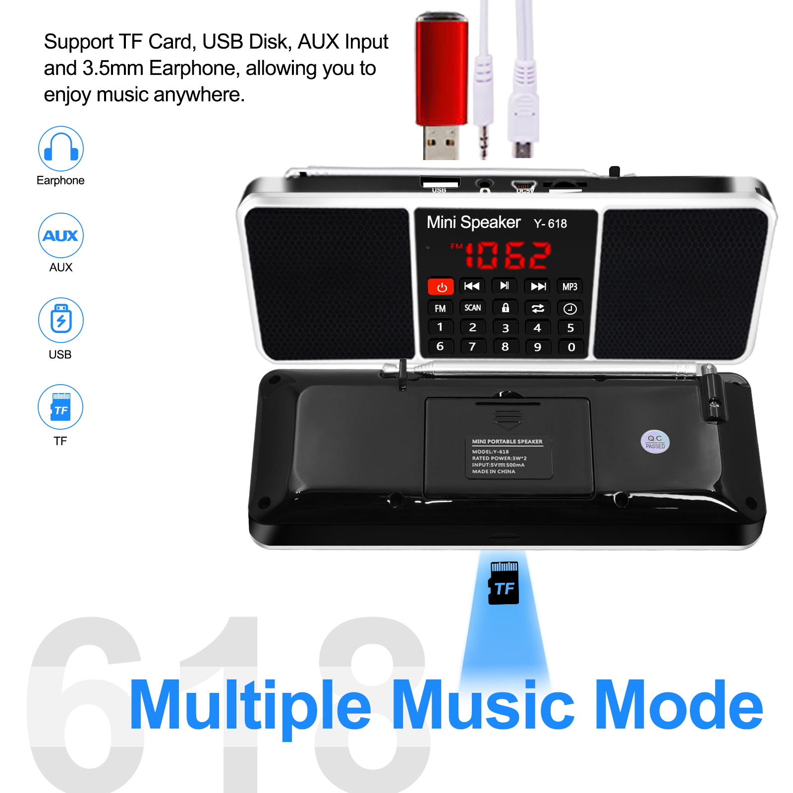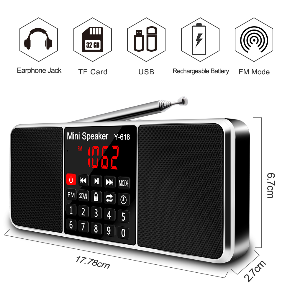 • MP3 музыкальный плеер поддерживает TF карту/USB диск; со стандартным разъемом 3,5 мм, что означает, что вы можете использовать наушники, если это необходимо. Он имеет большой светодиодный экран, который легко читается и очень полезен. Он также имеет длительный встроенный литий-ионный аккумулятор.