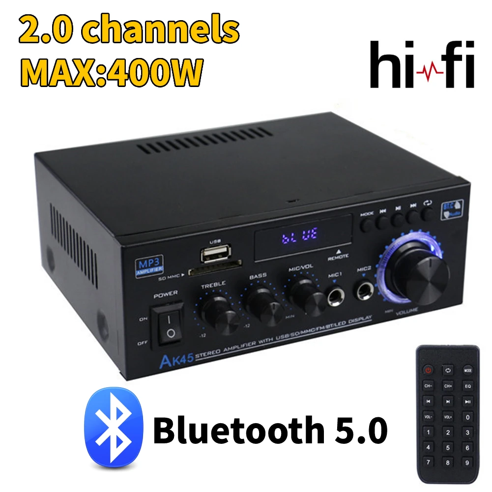 AK45 цифровой усилитель 40 Вт x 2 2,0-канальный стерео усилитель HiFi приемник 400 Вт x 2 переменного тока 90-240 В Bluetooth-совместимый 5,0 для домашнего автомобиля