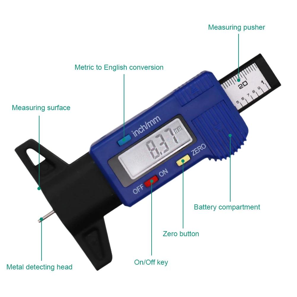 5. Удобный осмотр шин:Регулярная проверка толщины и износа шин имеет важное значение для вашей безопасности и работы автомобиля. С помощью этого цифрового толщиномера вы можете удобно проверять глубину шин и характер износа, что позволяет вам оставаться в курсе состояния ваших шин и принимать обоснованные решения относительно замены.