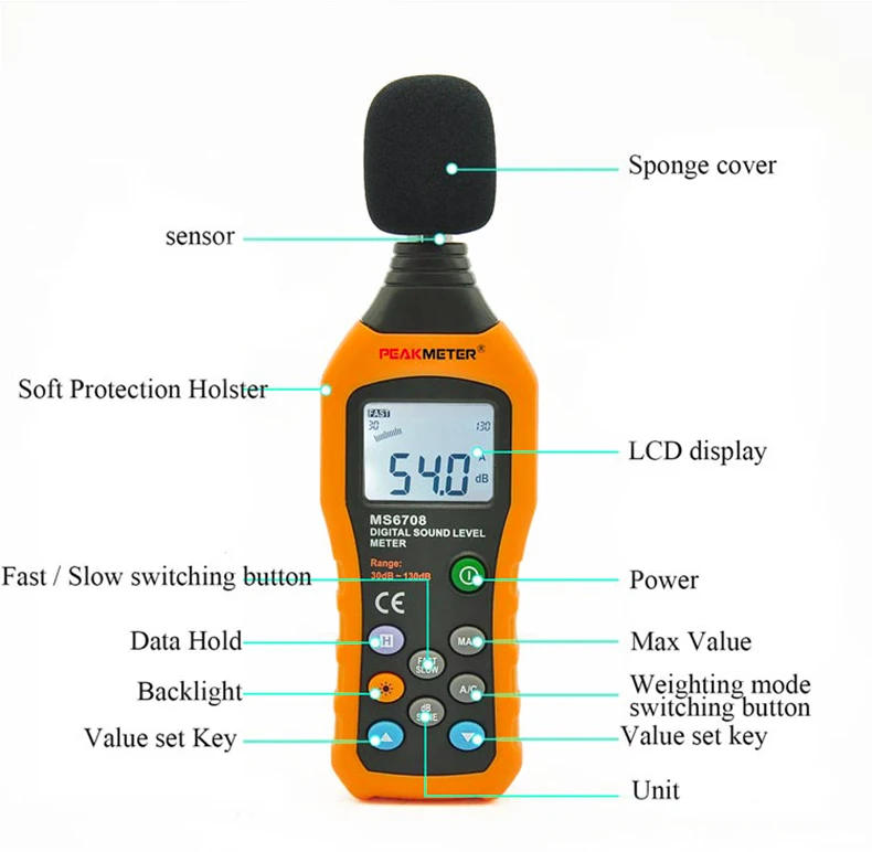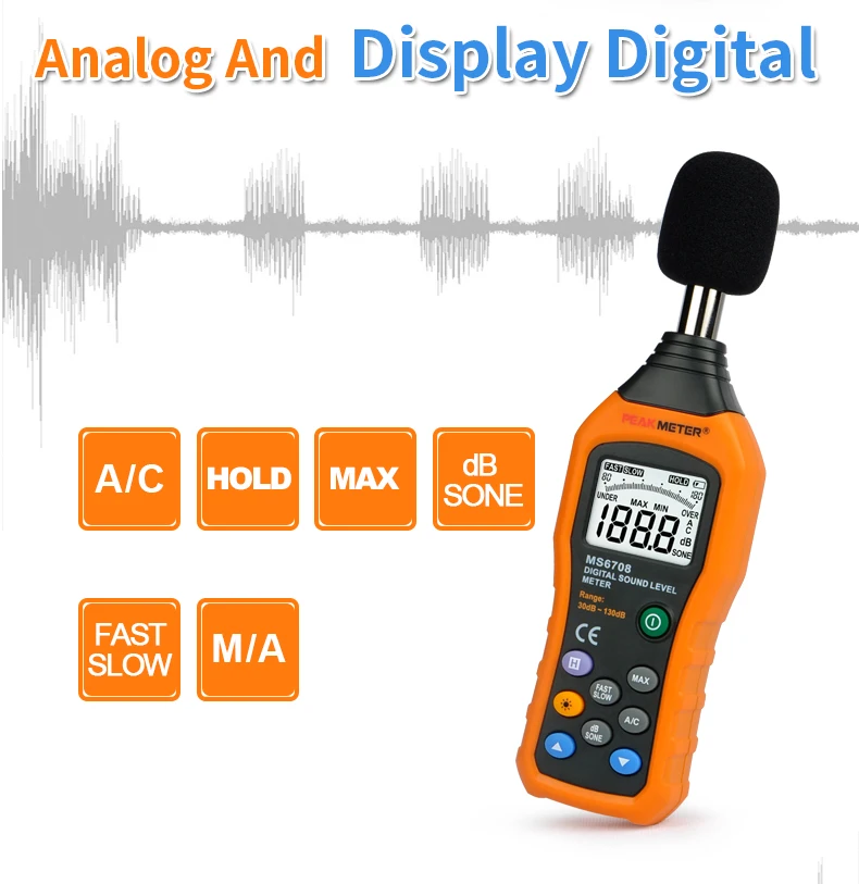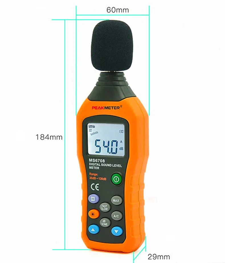 PEAKMETER PM6708 Цифровой измеритель уровня звука Шумомер Измерительный прибор дБ-метр Детектор звука 30-130 дБ Монитор децибел