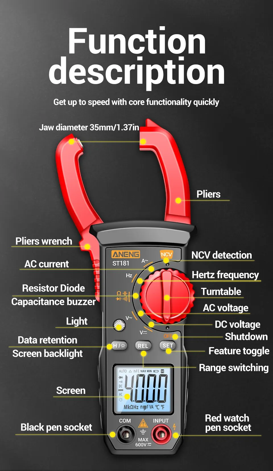 • Легко использовать :Токоизмерительные клещи ANENG ST181 с цифровым дисплеем и простым дизайном легко читать и использовать даже новичкам.