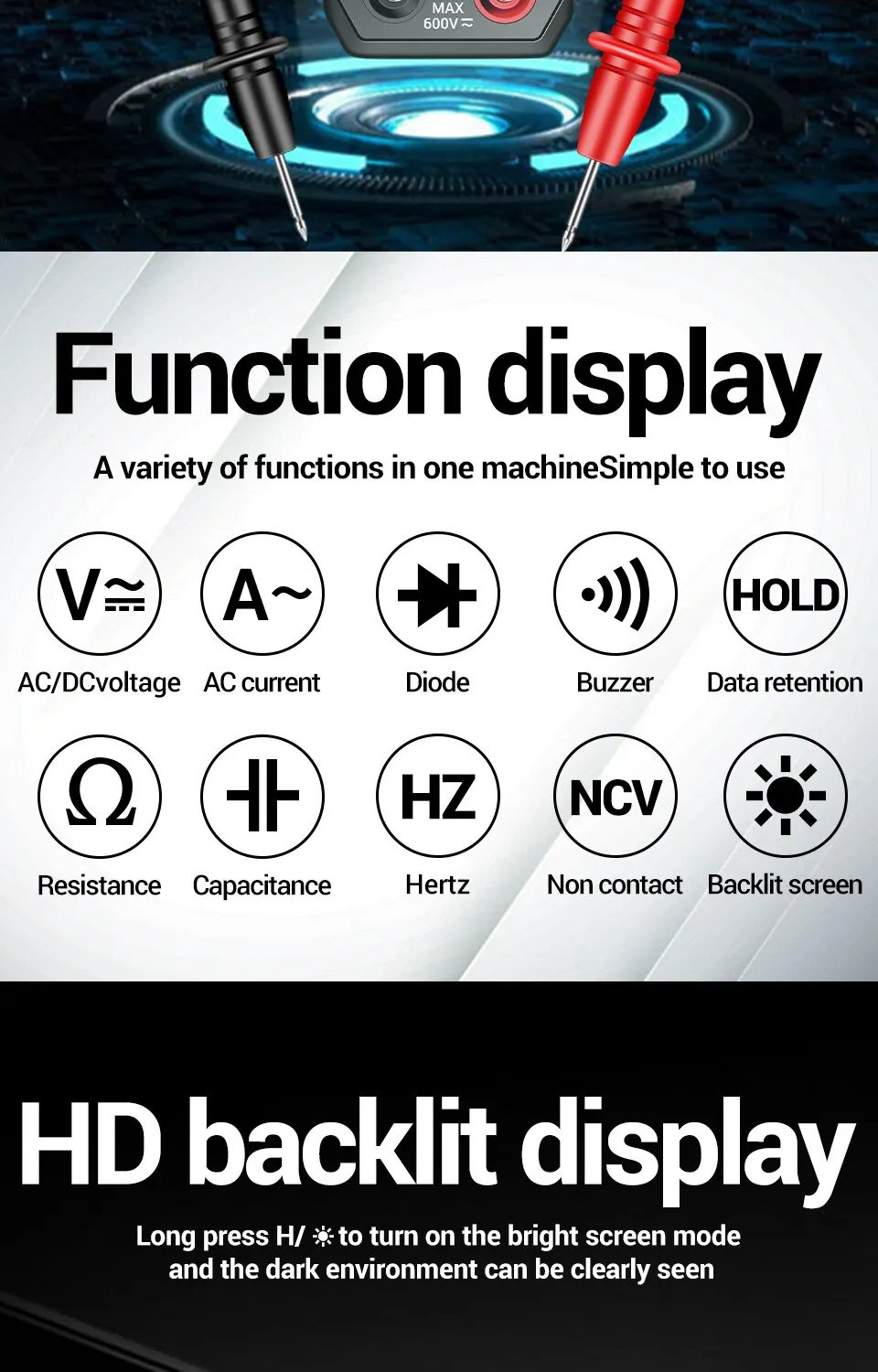 • Широкий спектр возможностей тестирования :Этот цифровой мультиметр может проверять постоянное/переменное напряжение, ток, емкость, НТС и Ом, что делает его универсальным инструментом для любого электрика.