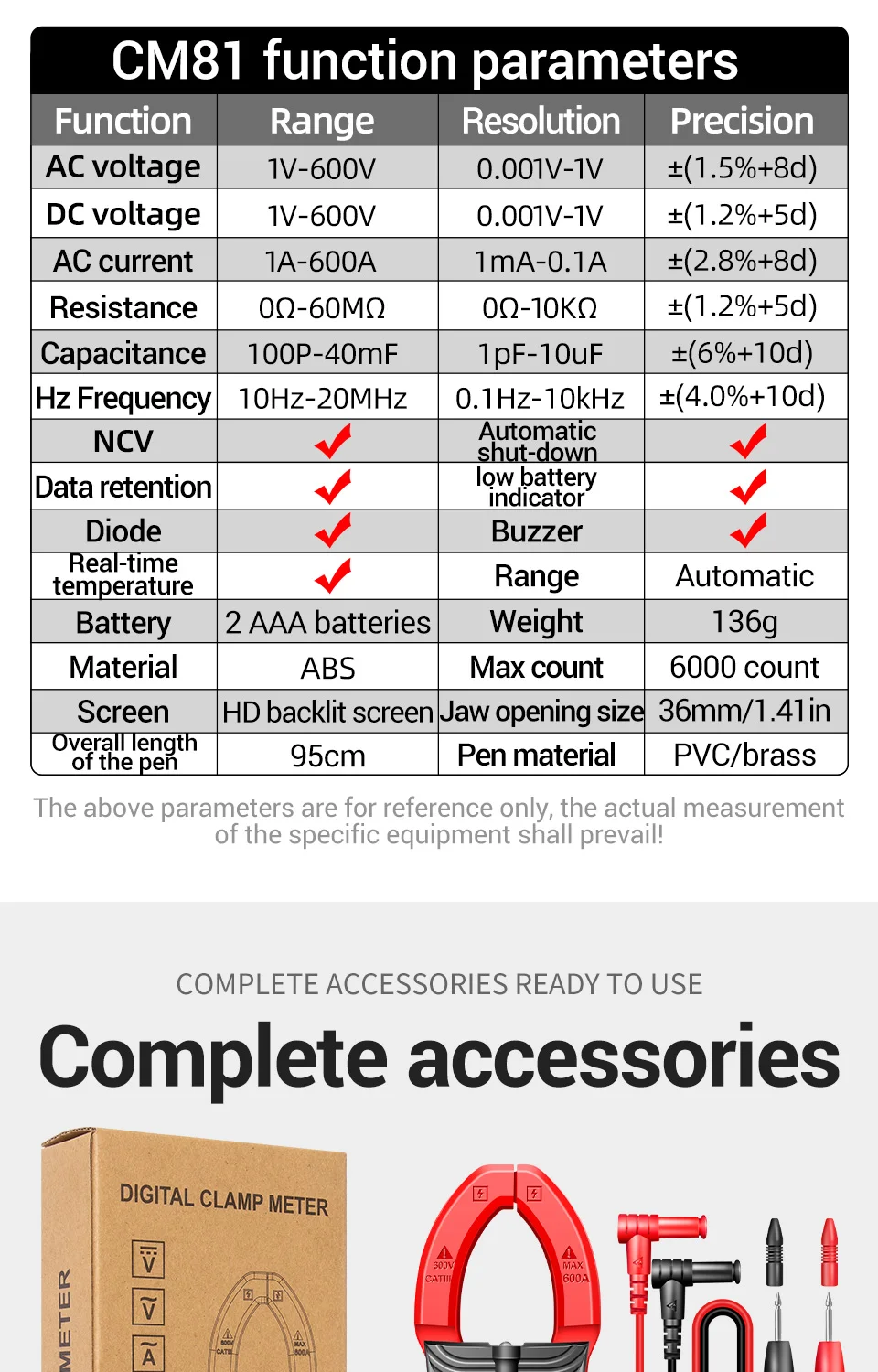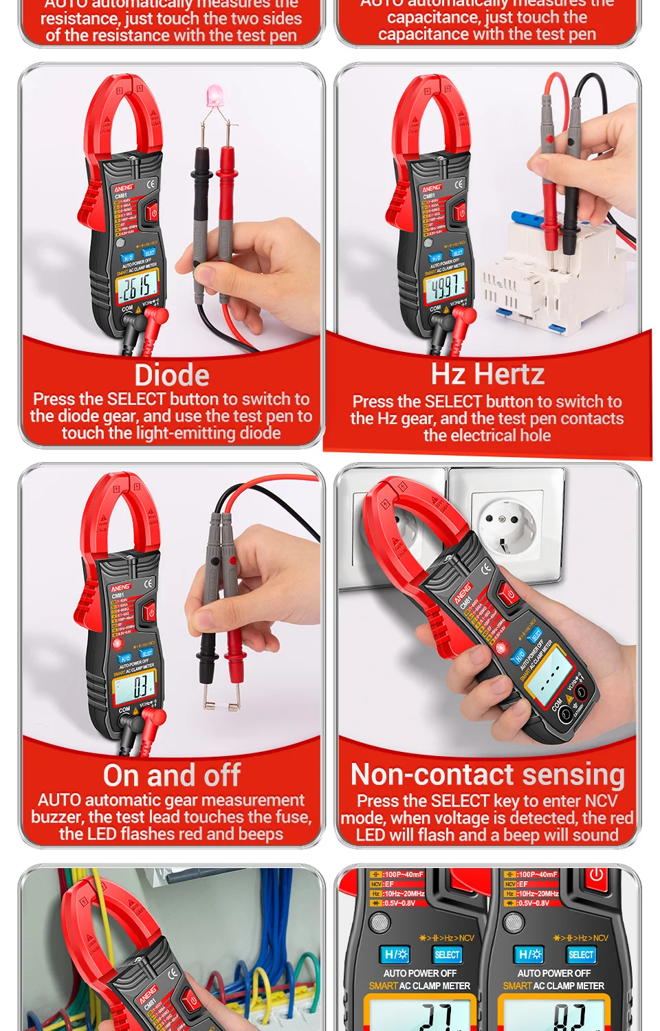 • ВОЗМОЖНОСТЬ ИСПЫТАНИЙ NCV :Обладая возможностью проверки на NCV (Бесконтактное напряжение), эти Токоизмерительные клещи безопасны в использовании и гарантируют, что вы можете работать с электрическими цепями без риска.