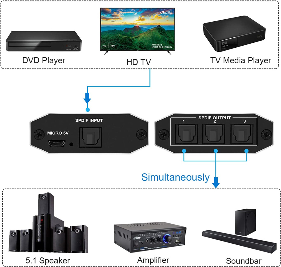 1. Использовать оптоволоконный кабель для подключения источника оптоволоконного сигнала (например, плеера BlueRay, компьютера и т. Д.) С входом разветвителя.