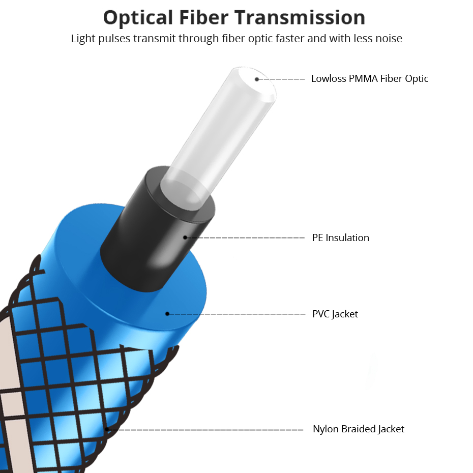 *Высококачественные встроенные цифровые аудио кабели:Оптические кабели имеют полностью гибкую нейлоновую плетеную куртку и сертифицированную продукцию, чтобы предоставить вам высококачественные долговечные оптические кабели.