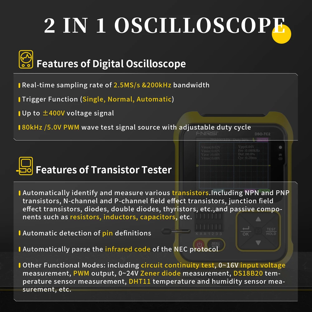 2 в 1 функции:Этот продукт гениально объединяет в себе цифровой осциллограф, тестер электронных компонентов, генератор сигналов ШИМ и другие функции.