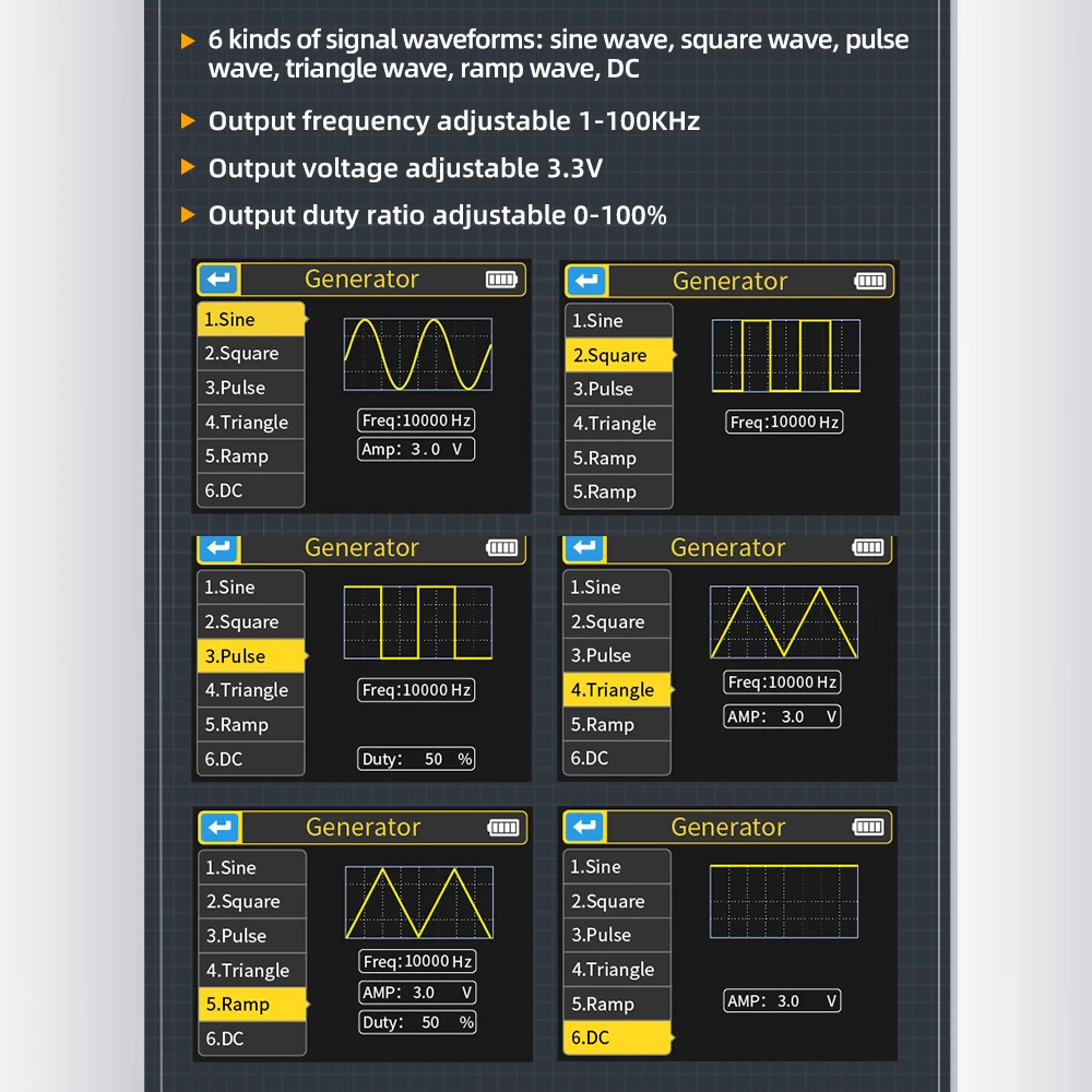 Функция генератора сигналов:6 видов сигналов: Синусоидальная, прямоугольная, импульсная, треугольная, рамповая, постоянный ток. Регулируемая Выходная частота 1-100 кГц. Регулируемое выходное напряжение 3,3 В. Регулируемый выходной коэффициент заполнения 0-100%.