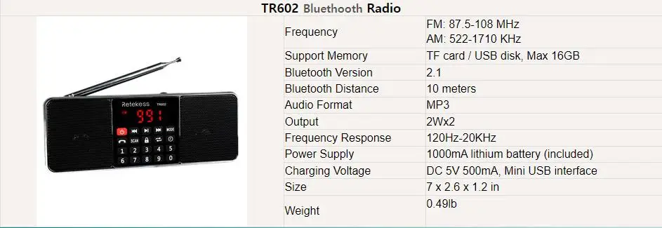 Цифровой портативный радиоприемник RETEKESS TR602, AM, FM, Bluetooth-колонка, стерео MP3-плеер, TF, SD-карта, USB-накопитель, функция громкой связи