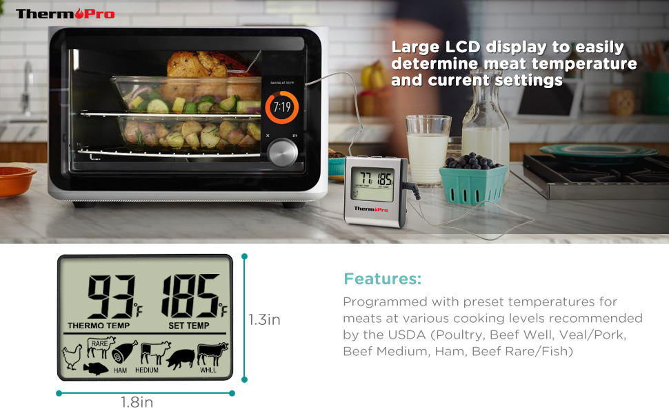 Термометр ThermoPro TP-16 для пищевых продуктов позволяет опытному или неопытному повару точно и быстро измерить внутреннюю температуру мяса. Благодаря конструкции наконечника зонда STEP-DOWN и ЖК-дисплею легко получить и увидеть точную температуру. Либо поместите на стойку с откидной подставкой, либо намагнитите металлическую поверхность, будь то барбекю или духовка. Не беспокойтесь о потере счета времени, так как этот термометр для приготовления пищи также содержит таймер. Наконец, если вы не профессионал на кухне, мы включаем одобренные USDA заданные температуры.
