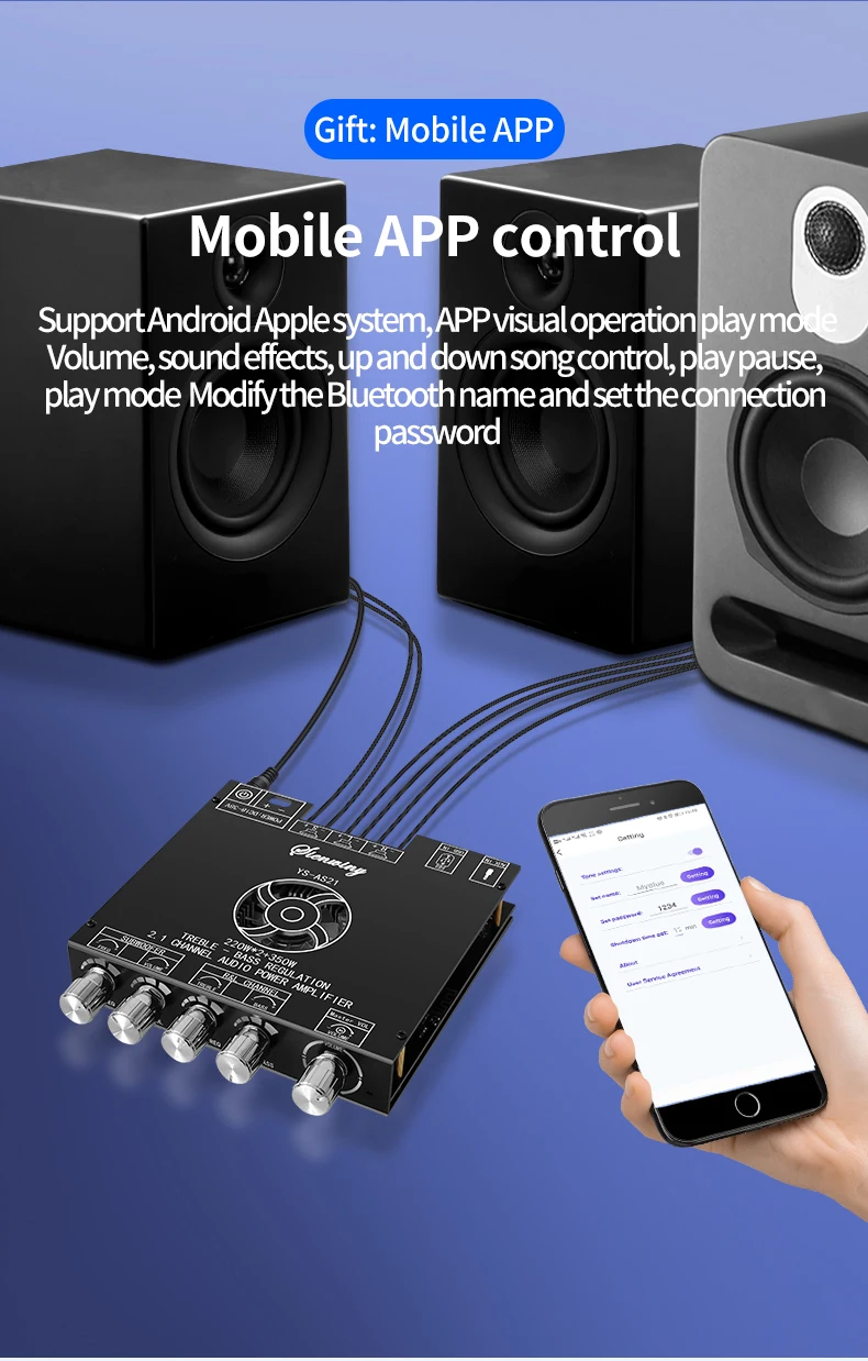 7. Поддержка YS Audio APP, приложение поставляется с оперативной музыкой, поддержка изменения имени BT, установка BT пароля,